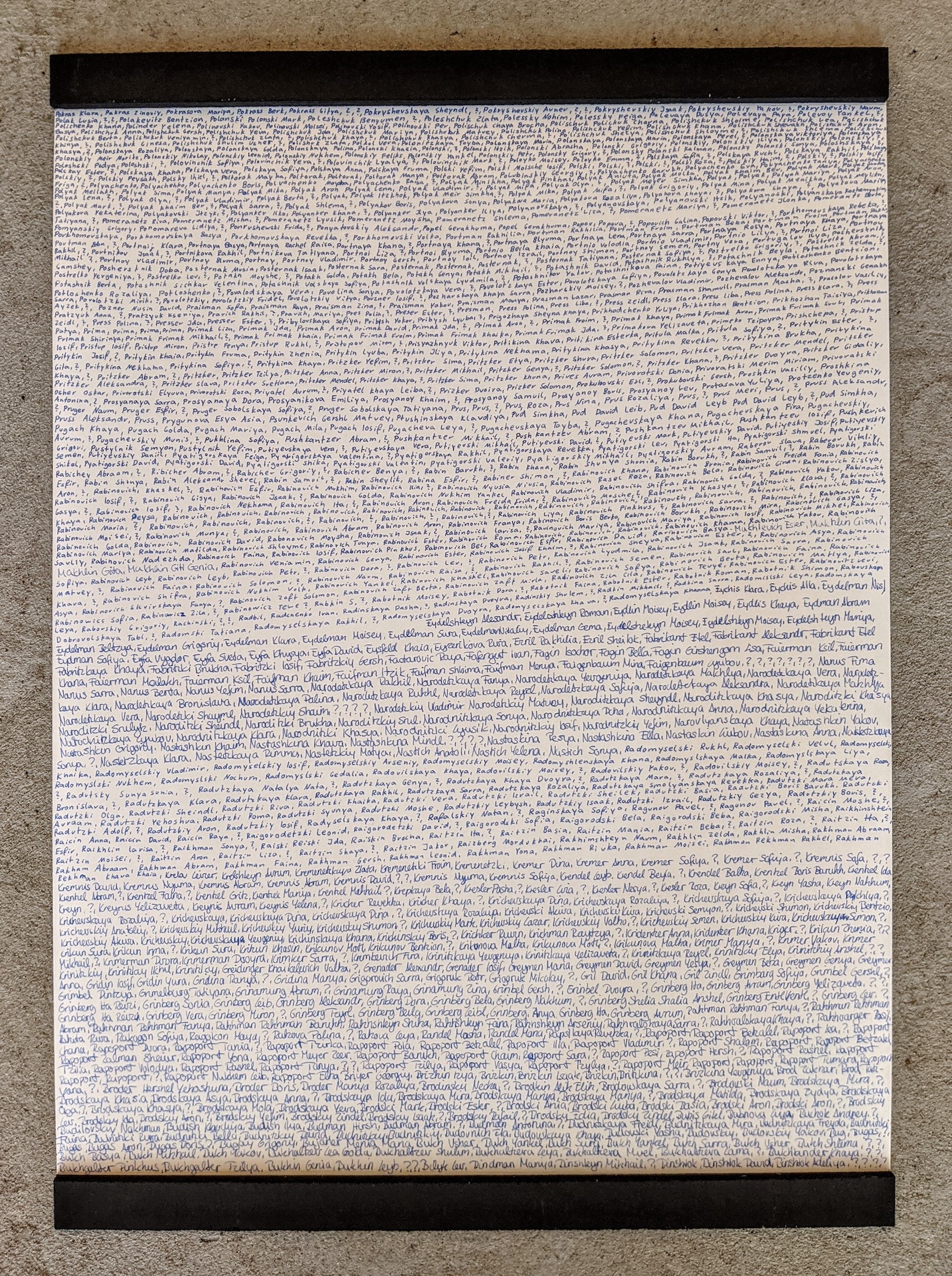 Einzelblatt der Gedenkpräsentation mit den Namen der Ermordeten des größten Einzelmassakers im Zweiten Weltkrieg… Diese Arbeiten wurden vom Dokumentartheater Berlin an der Gedenkstätte in Kiev gezeigt.
