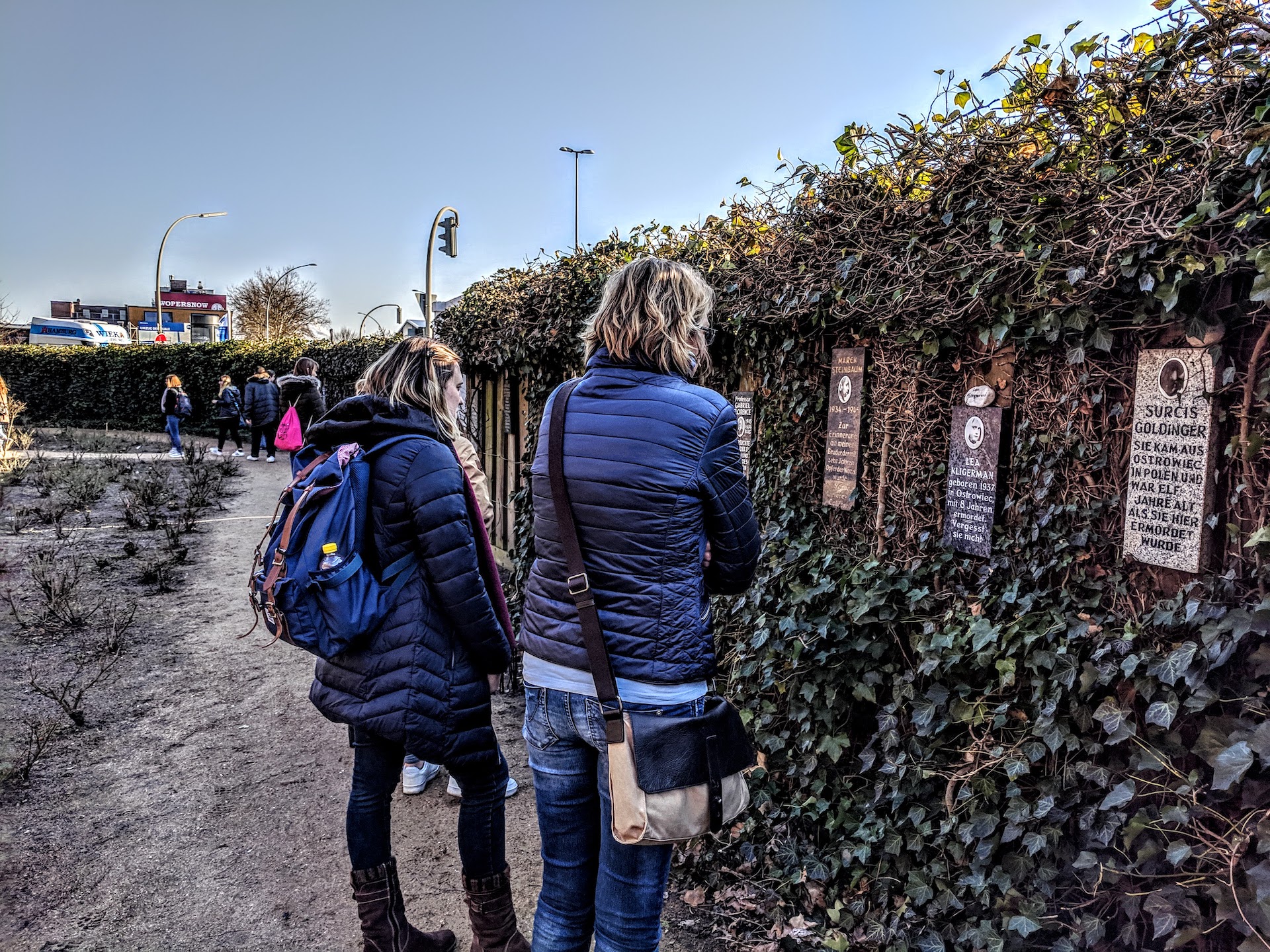 Huder Lernende und Betreuerinnen im Rosengarten der Gedenkstätte am Bullenhuser Damm…