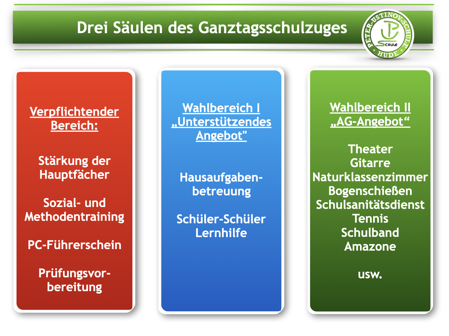 Der verpflichtende Ganztagsunterricht wird für ein Methoden- und Sozialkompetenztraining und für vertiefende Unterstützung bzw. weitergehende Anforderungen in den Hauptfächern sowie zur Hausaufgabenbetreuung genutzt.
