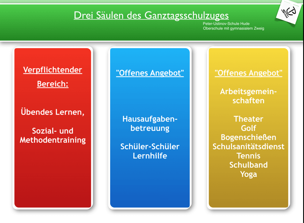 Der verpflichtende Ganztagsunterricht wird für ein Methoden- und Sozialkompetenztraining und für vertiefende Unterstützung bzw. weitergehende Anforderungen in den Hauptfächern sowie zur Hausaufgabenbetreuung genutzt.