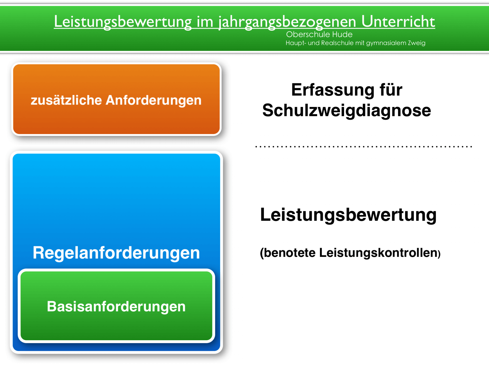 Im 5. und 6. Jahrgang ergibt sich bezüglich der Leistungsbewertung im jahrgangsbezogenen (gemeinsamen) Unterricht eine besondere Situation. Die Grundlage der Leistungsbewertung sind die sogenannten Regelanforderungen, welche den Kompetenzanforderungen der Realschule entsprechen. Weiterführende Anforderungen, welche den Kompetenzanforderungen des Gymnasiums entsprechen, sind im binnendifferenzierenden Lernangebot der Fächer enthalten. Diese werden aber nicht im Sinne einer Leistungsbewertung erfasst, sondern hinsichtlich einer Diagnose bezüglich des Besuches unseres gymnasialen Zweigs ab dem 7. Jahrgang verwendet. Da wir im 5. und 6. Jahrgang mit Arbeitsplänen arbeiten, finden Sie die weiterführenden Anforderungen dort als Zusatzaufgaben deklariert. In den schriftlichen Leistungskontrollen befinden sich zudem Zusatzaufgaben, welche diese gymnasialen Anforderungen abbilden. Diese Zusatzaufgaben fließen jedoch, wie gesagt, nicht in die Leistungsbewertung mit ein.
