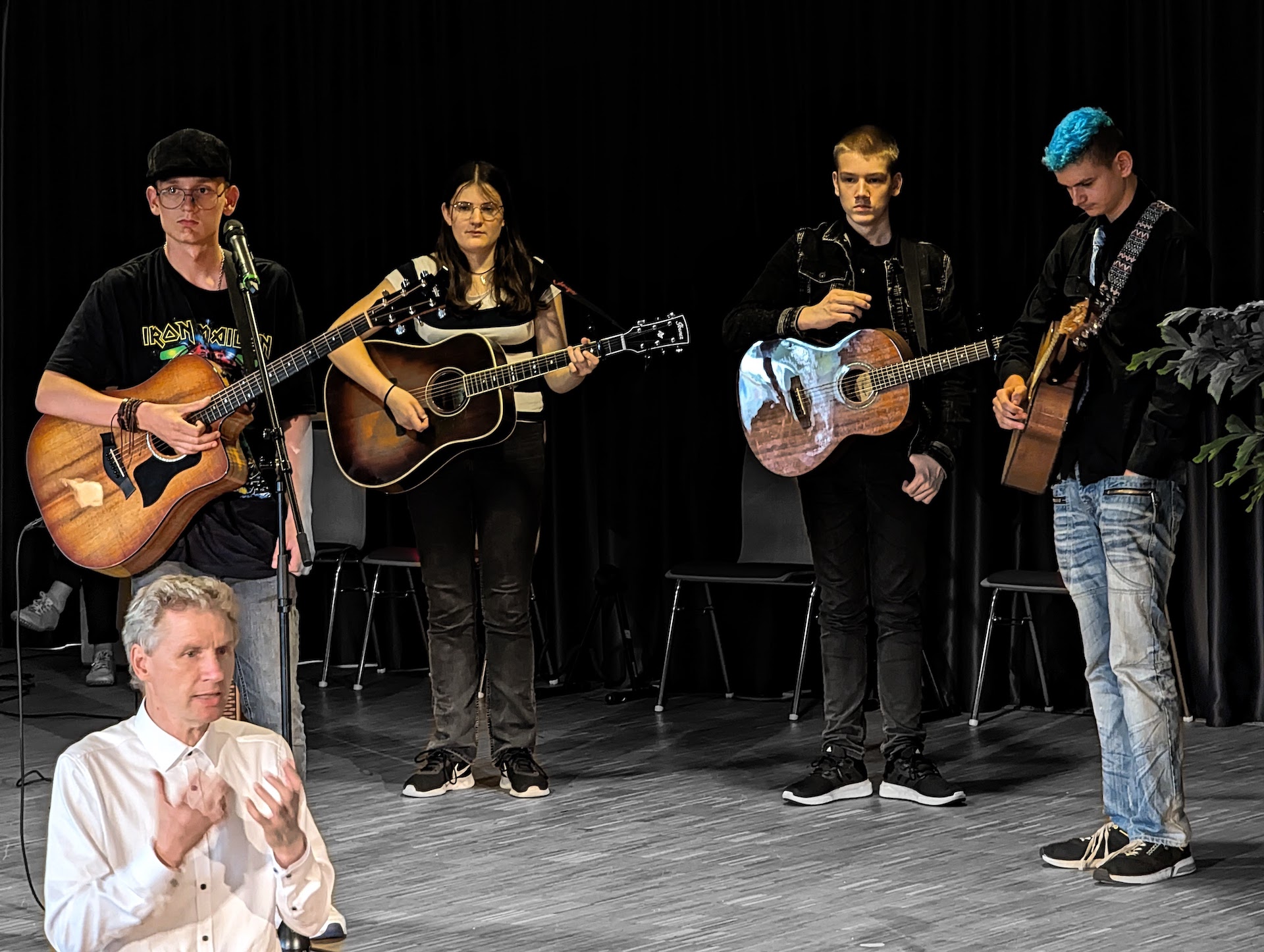 Zwischenzeitlich wurden die Feierstunden immer wieder von der Schulband gestaltet, die einige Songs lieferte. Herr Kirsch, der didaktische Leiter, führte wie gewohnt souverän durch das Programm.