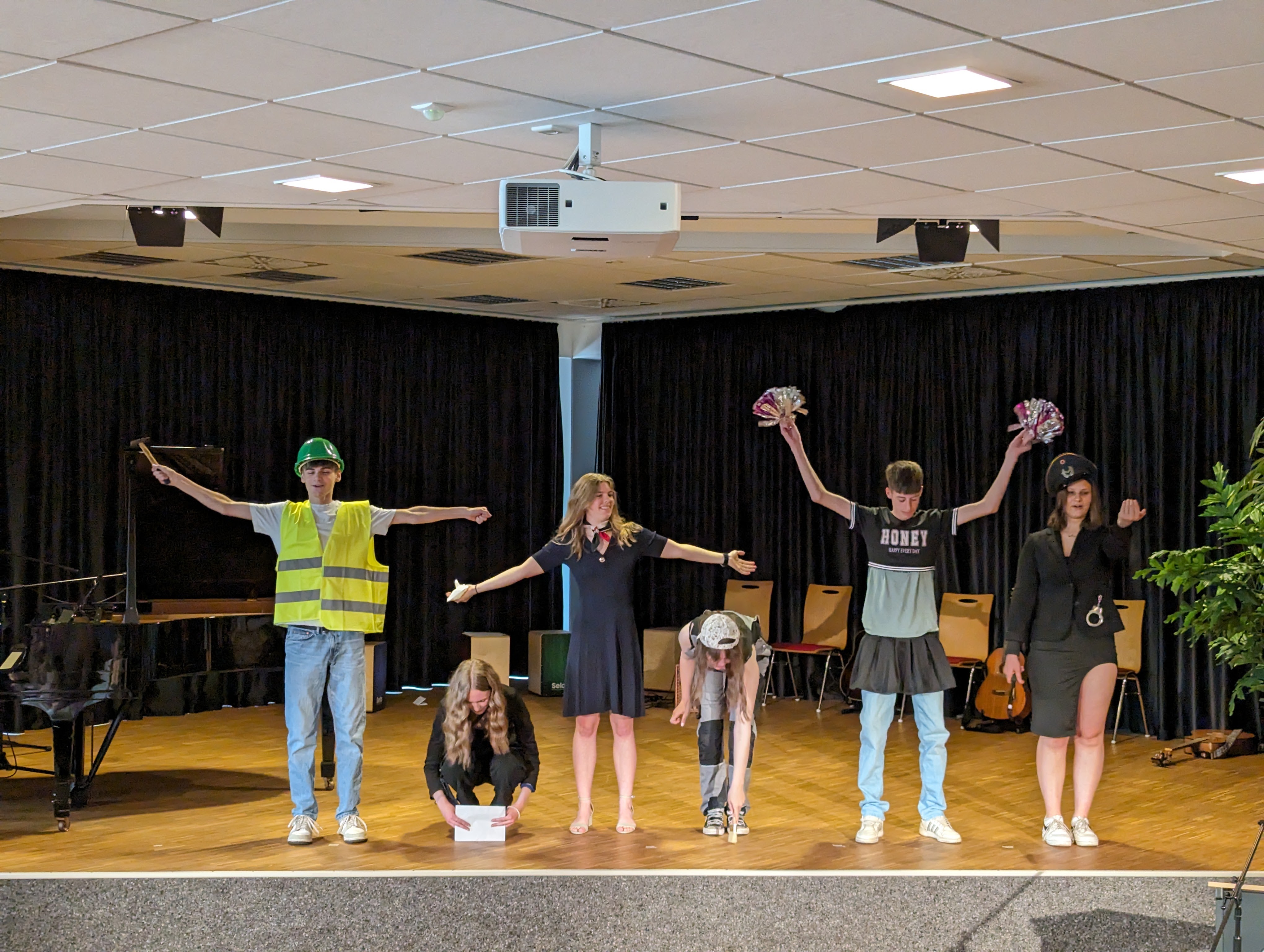 Für große Heiterkeit sorgten die Klassen selbst, aus deren Reihen einige Lernende Sketche aufführten, die den Schulalltag etwas ironisierten…