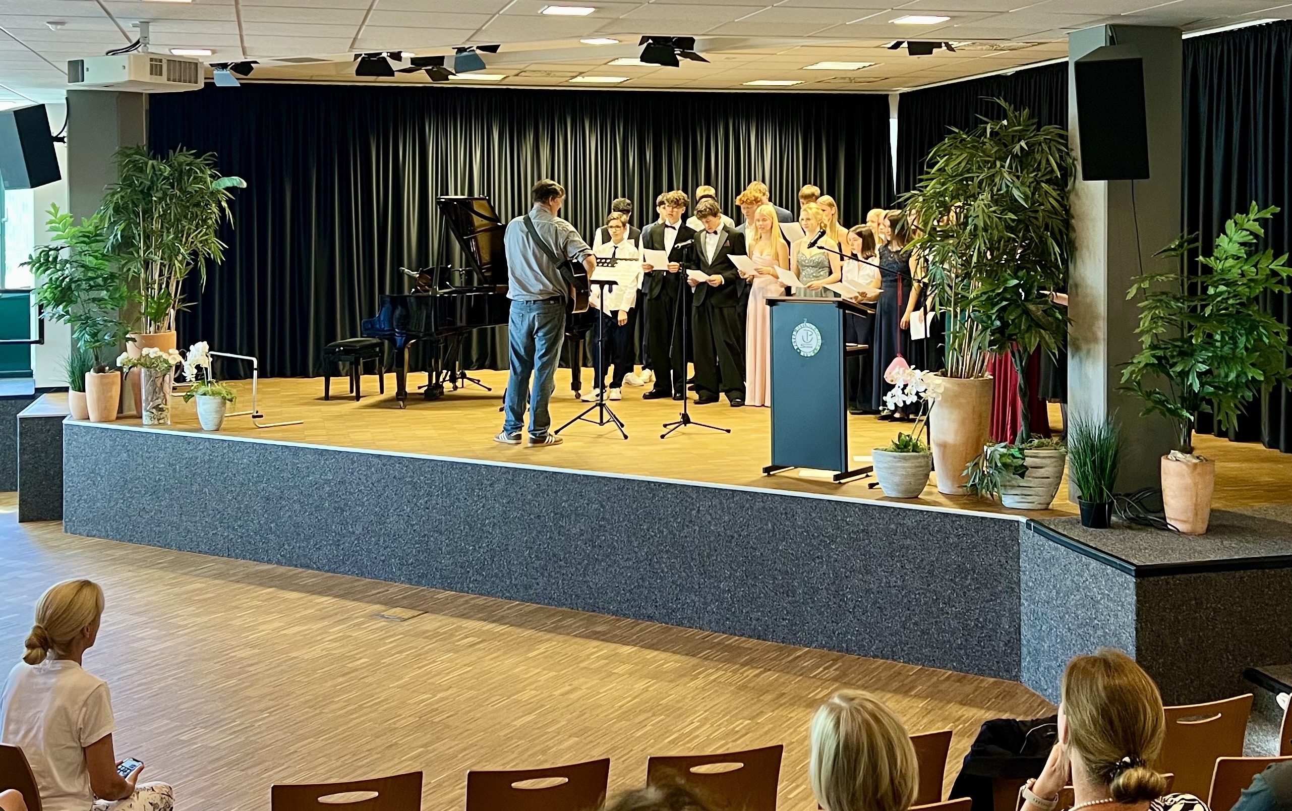 Die Abschlussfeier wurde von einem vielseitigen musikalischen Programm begleitet. Die Klassen selbst trugen mit eigenen Beiträgen zur musikalischen Untermalung bei und sorgten für eine stimmungsvolle Atmosphäre. Ein besonderes Highlight war der Auftritt einer Schülerin aus dem 8. Jahrgang, die mit ihrem Beitrag am Klavier das Publikum begeisterte. Den krönenden Abschluss bildete das Lied „We’re the Champions“ von Queen, das von Frau Hermann am Klavier gesungen wurde. Diese Darbietung rührte viele Anwesende und sorgte für einen emotionalen Höhepunkt der Veranstaltung.