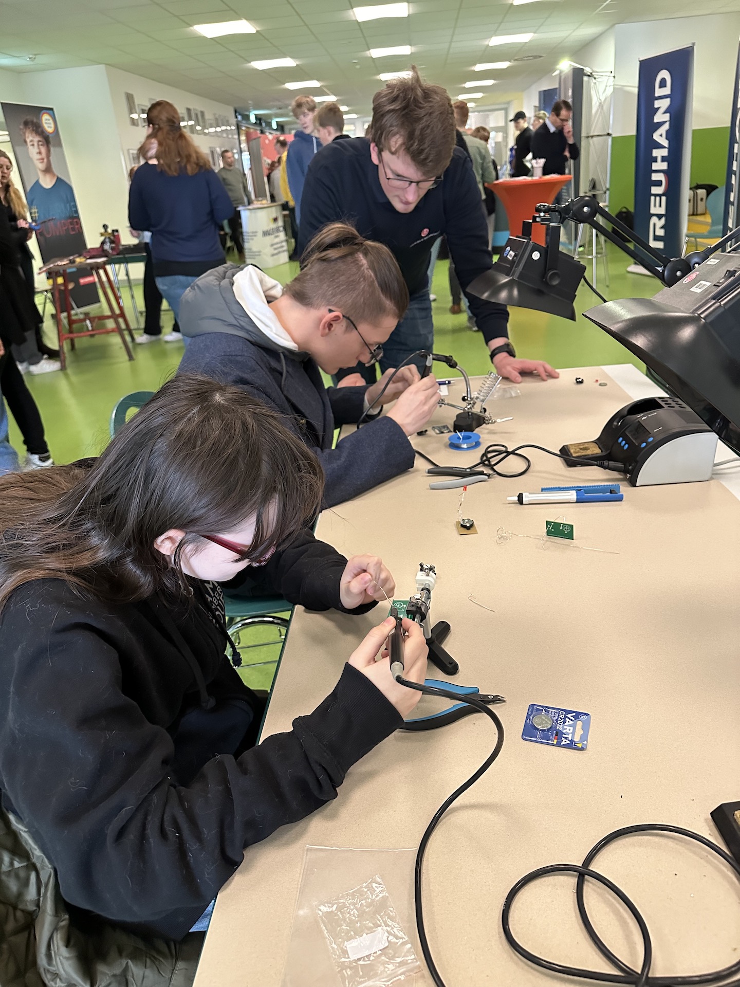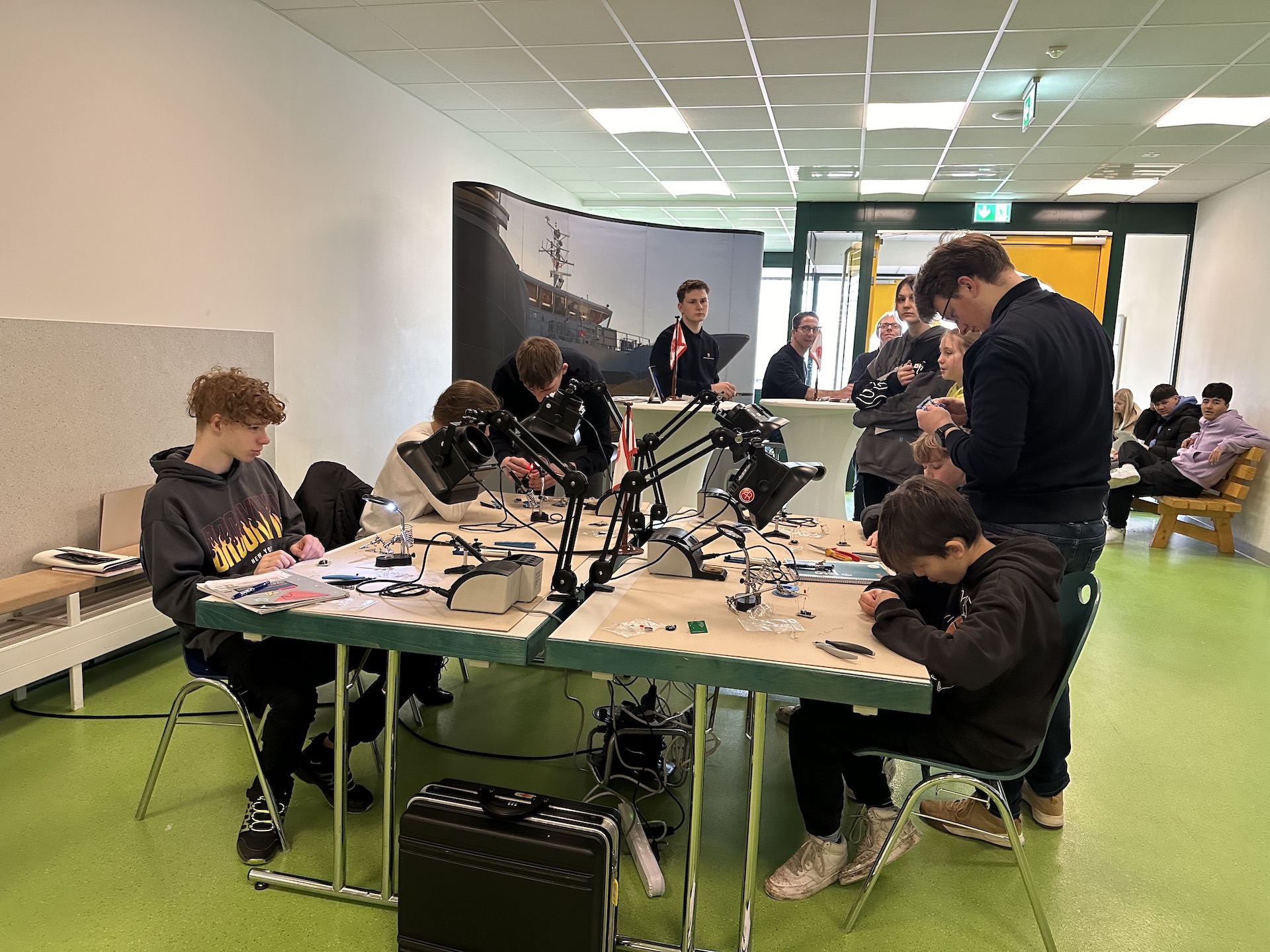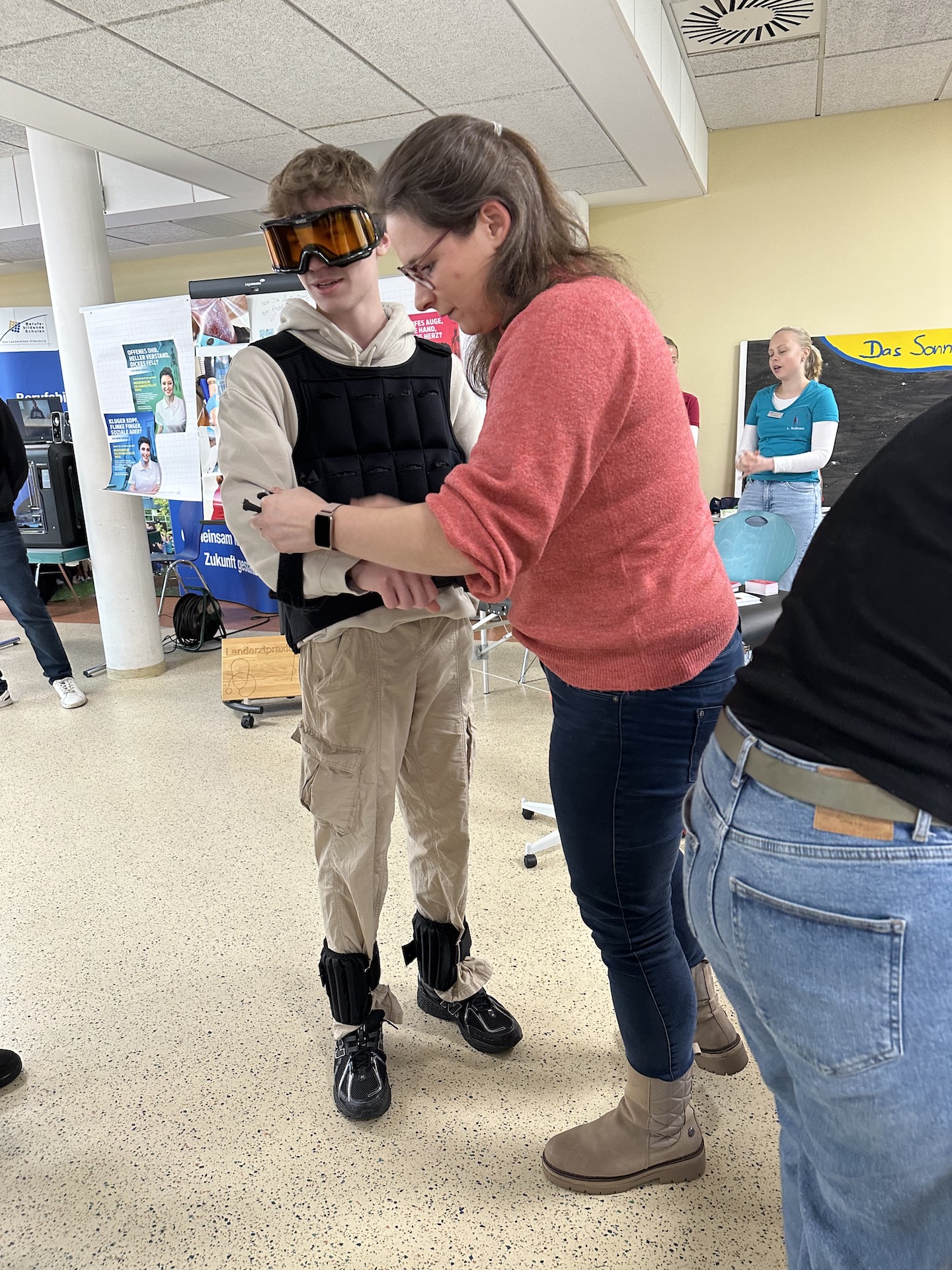 Es herrscht ein lebendiges Treiben in der Mensa, der Pausenhalle und draußen vor der Peter-Ustinov-Schule, in der sich 38 Firmen einfanden, um den Schülern und Schülerinnen Rede und Antwort zu stehen und ihnen durch praxisnahe Übungen die Berufe näherzubringen.