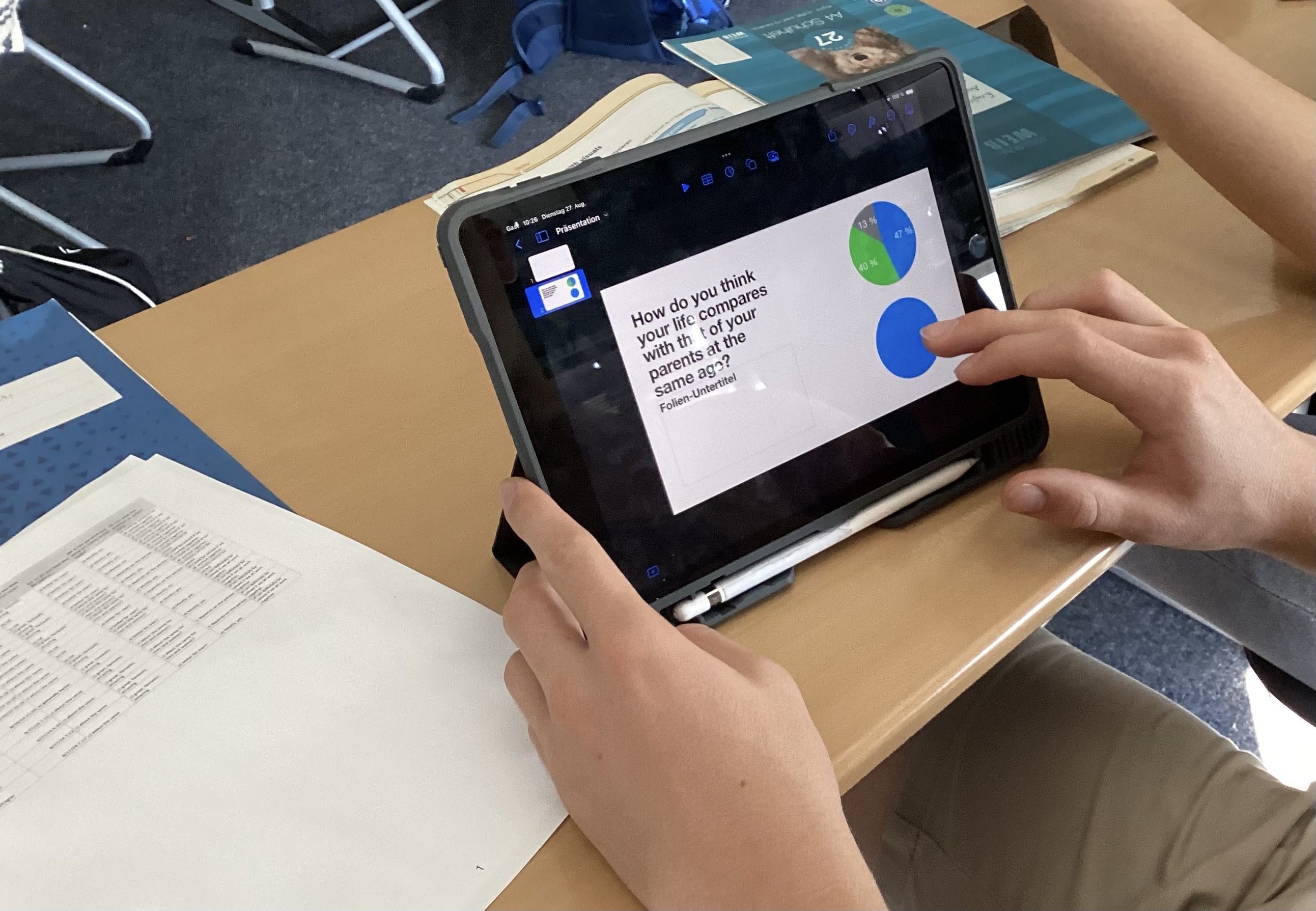 Evaluating the data from the online survey (held anonymously) with the help of the IPads. Looks very professional… = )