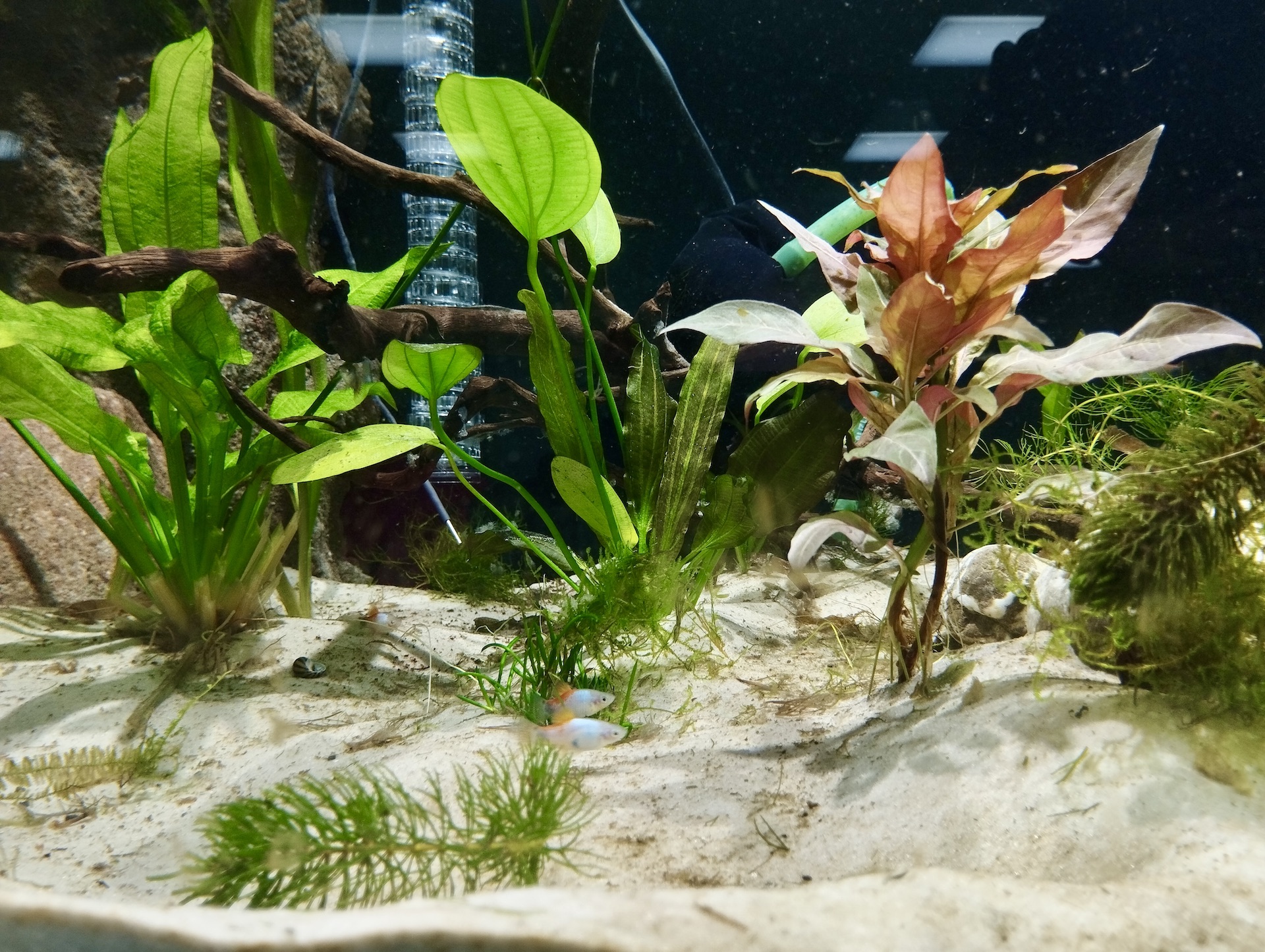 Diese befanden sich alle im Normbereich, so dass schließlich die ersten Fische (Platys) einziehen konnten. Neben den Fischen bewohnen bereits Garnelen (Neocaridina) und Schnecken (Zebrarennschnecke) das Aquarium.