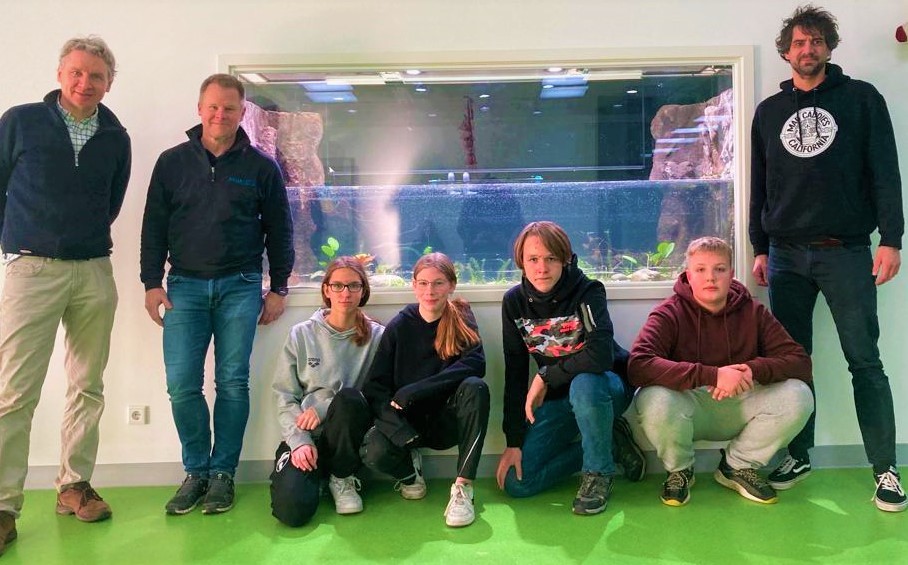 Nachdem die Aquarium-AG sich in den vergangenen Monaten intensiv um den Bau der Rückwände für das Aquarium und die Vorbereitung der Einrichtung gekümmert hatte, konnten nun endlich die ersten Fische einziehen.