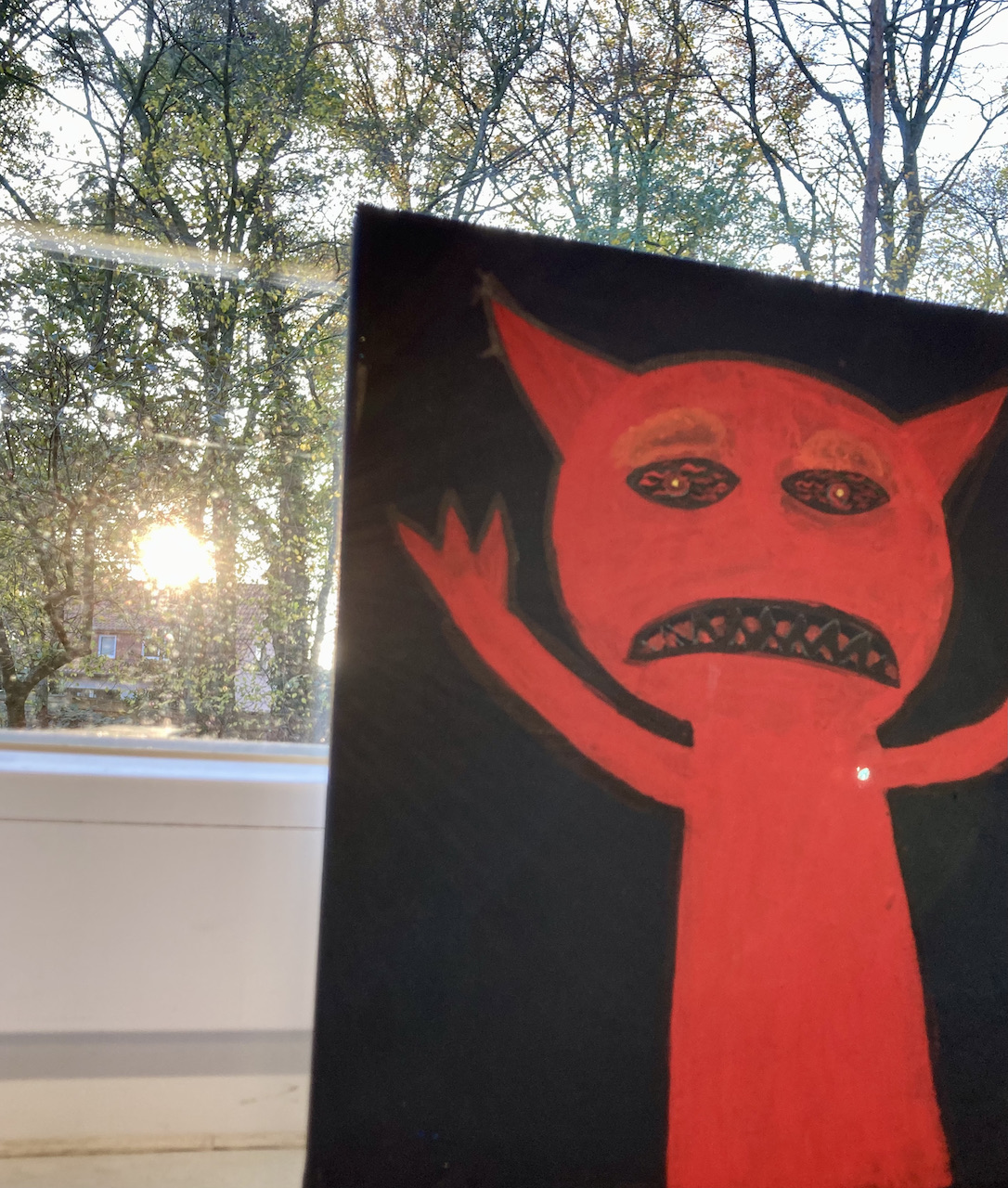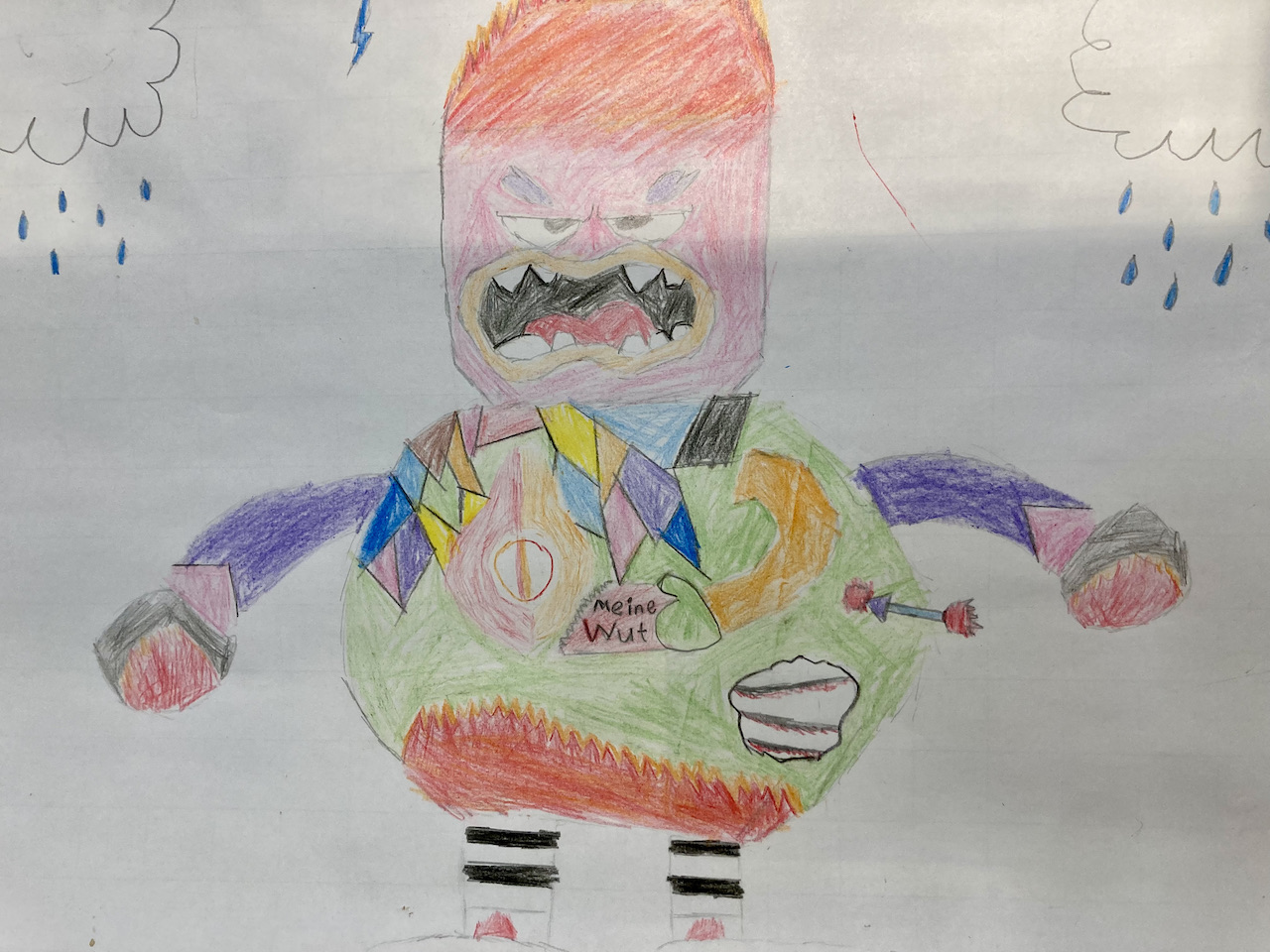 Die 5. Klasse hat versucht, in einem Malwettbewerb das Gefühl Wut sichtbar zu machen. Gewonnen hat das Wutmonster von Marie. Den zweiten Platz belegt Carlos Monster und ebenfalls ehrenwert ist das Bild von Sally, das sie auf Leinwand gemalt hat.