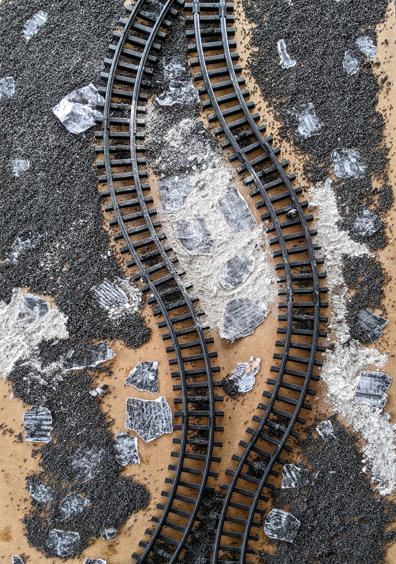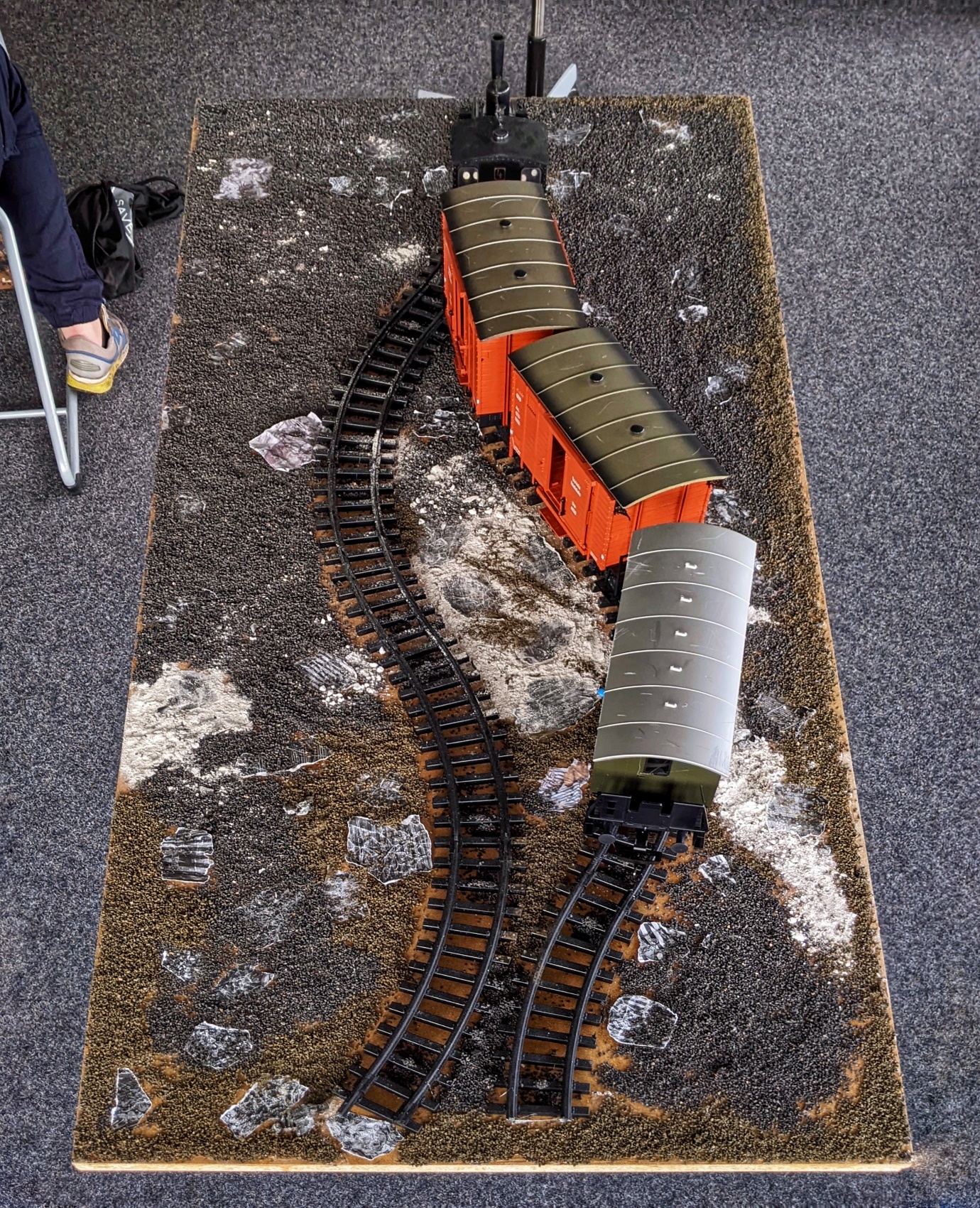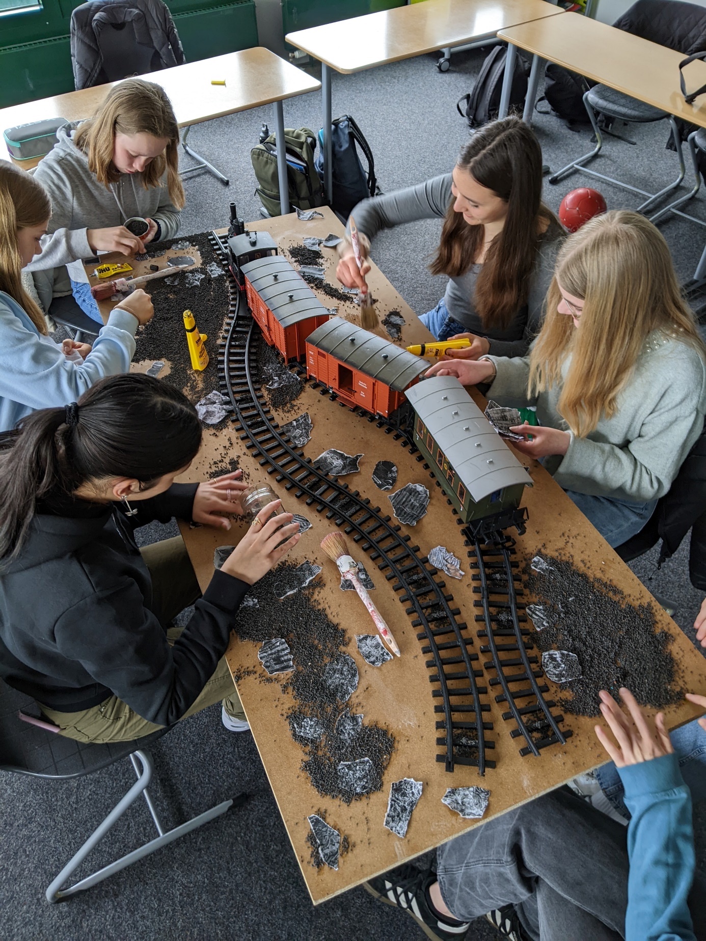 Das aufwändig gestaltete Diorama, dessen Gleisbett von Darstellungen der KZ-Bekleidung u.ä. gesäumt wird, ist mit einer professionell gefertigten Sicherheitsglashaube abgedeckt, die ein Vater speziell für uns in seinem Betrieb selbstlos angefertigt und uns geschenkt hat! Für diese großartige Unterstützung können wir kaum angemessen danken… Für den Zug kauften wir mit Unterstützung des Fördervereins Modelle in der Spurweite G, die eine respektable Größe aufweist und im Maßstab zu unseren Figuren passt. Im Diorama bewegt sich der Deportationszug auf Auschwitz zu, was durch eine historische Fotowand an der Stirnseite dargestellt ist.