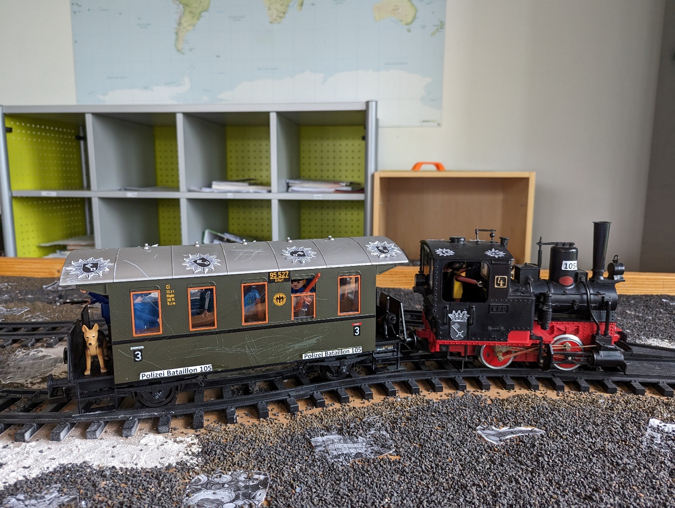 Auch um einen regionalen Bezug in die nachhaltige Erinnerungsarbeit einzupflegen, haben wir uns entschlossen, die Geschichte dieser Verbrechen aufzuarbeiten. Nachdem die vorangestellte Recherche zu den Taten des Bataillons 105 abgeschlossen war, diskutierte die Lerngruppe wie sie das Thema visualisieren sollte. Um das Geschehen möglichst realistisch anzudeuten, beschloss die Klasse 9Rb im Schuljahr 20022/2023, ein Diorama mit einem verkürzten Deportationszug zu gestalten. Dabei sollte Wert auf würdevolle Distanz gelegt werden, so dass zur Symbolisierung der Gefangenen einheitlich grau gefärbte Spielzeugfiguren benutzt wurden, während die Polizisten in „Uniform“, bewaffnet und mit Wachhunden dargestellt wurden. Gerade auf den eigentlichen Beruf der Täter sollte sich der Blick der Betrachter richten. Schon im Dritten Reich warb die Polizei mit dem noch heute genutzten Slogan: „Dein Freund – dein Helfer!“ Angesichts der unmenschlichen Verbrechen, in die die Polizeieinheiten in Nazi-Deutschland verwickelt waren, stellt sich die berechtigte Frage nach dem Fortbestand dieser Aussage in der Bundesrepublik. An unserem Diorama prangt der Slogan deshalb deutlich sichtbar mit einem Fragezeichen anstelle des Ausrufezeichens.