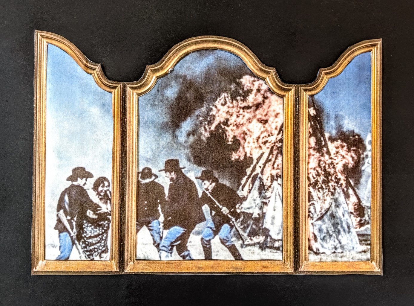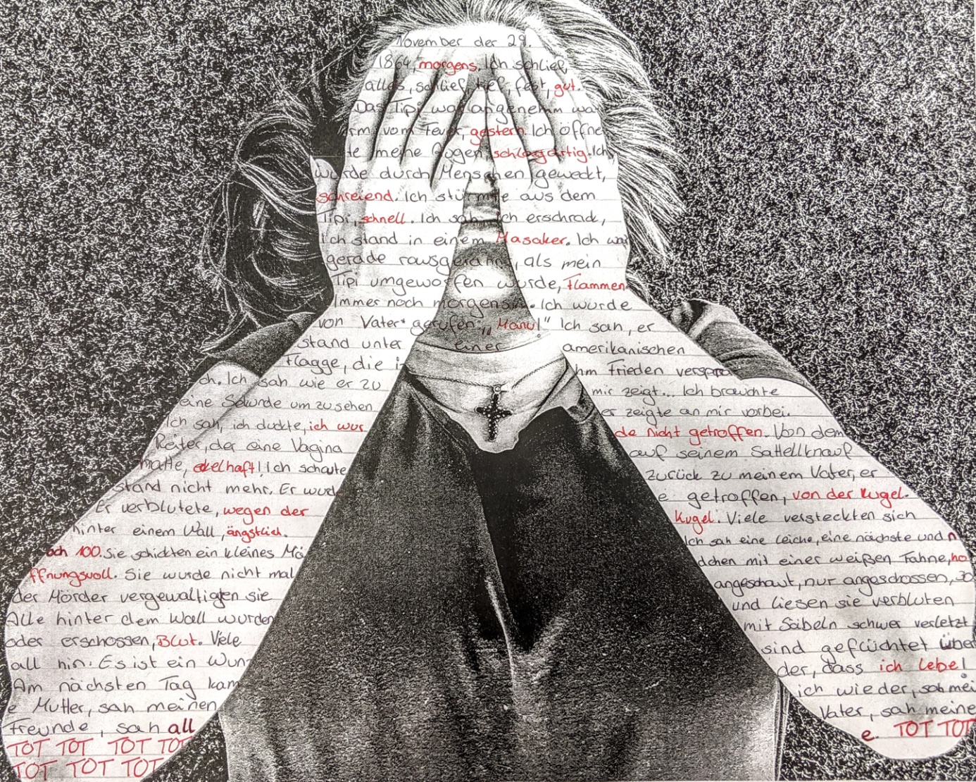 Die Präsentation zum Massaker von Sand Creek beinhaltet politische Kunstwerke und Plakate, die in Eigenregie hergestellt worden sind. Das zentrale Relief, die US-Flagge mit Patronenhülsen spielt auf die brutale Gewalt an, durch die die USA u.a. entstanden sind. Der Titel des Werkes steht im Kontrast zum s. g. „american dream“, der nicht für jeden Bewohner des US-Territoriums Realität werden konnte! In einer rein technischen Adaption einiger fotografischer Kunstwerke der exiliranischen Küstlerin Shirin Neshat, haben sich die Lernenden der aktuellen 9Ga an der Peter-Ustinov-Schule in die Opfer hineinversetzt und ihre eigenen Portraits mit essentiellen Botschaften christlicher und demokratischer Kultur versehen. Die Identifikation mit dem Leid der Cheyenne auf der einen Seite und mit der eigenen christlich-abendländischen Herkunftskultur auf der anderen Seite macht deutlich, wie schmal die trennende Linie zwischen Liebe und Hass sowie Leid und Glück ist. So werden die Aufarbeitung der schrecklichen Ereignisse am Sand Creek und ihre Präsentation zu einem überzeugenden Plädoyer gegen jede Form zwischenmenschlicher Gewalt. Die Erinnerung an dieses Verbrechen gegen die Menschlichkeit soll helfen, die Verantwortung des Menschen gegenüber anders Denkenden und Lebenden als Pflicht zum Frieden zu erkennen!