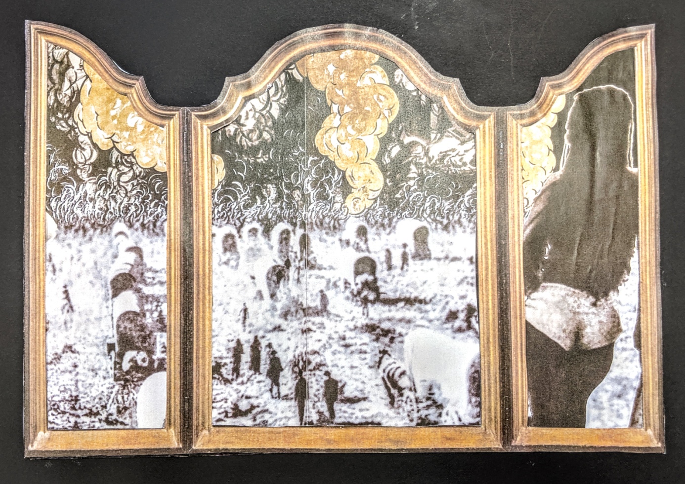 „Friede wohne in deinen Mauern, in deinen Häusern Geborgenheit“, Triptychon mit Filmstill auf Papier, Klasse 9Ga 2019