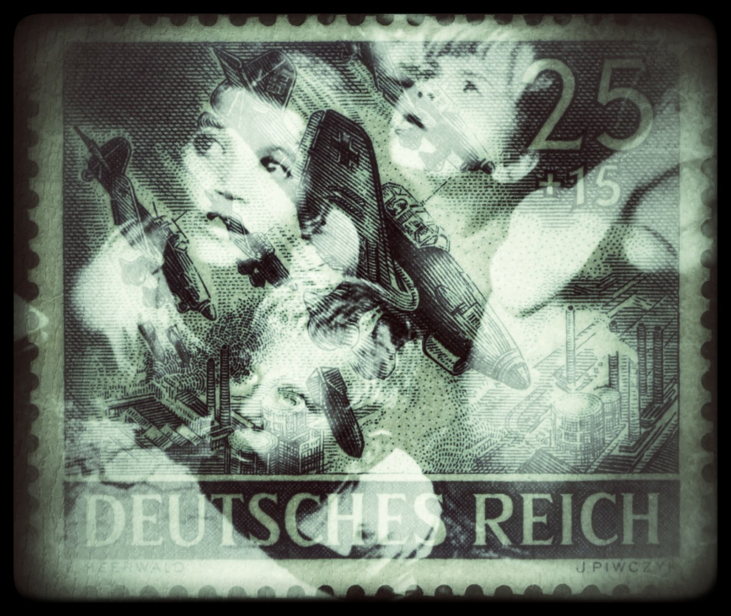 „Verlorene Seelen“ Fotomontage aus Reichspostwertzeichen mit Stukamotiv und osteuropäischen Kindern während eines deutschen Luftangriffs, Fotoarbeit J. Leopold 2021