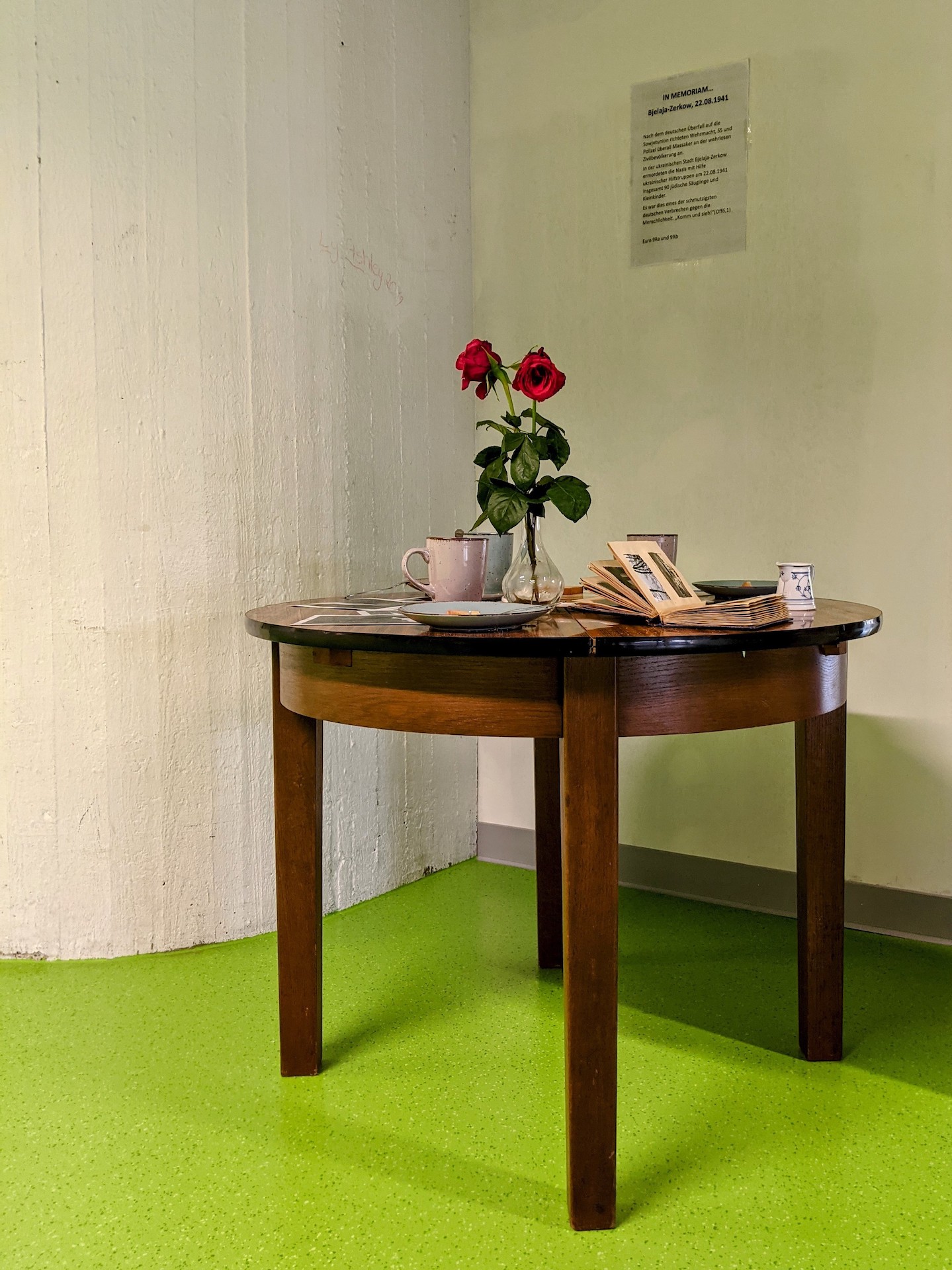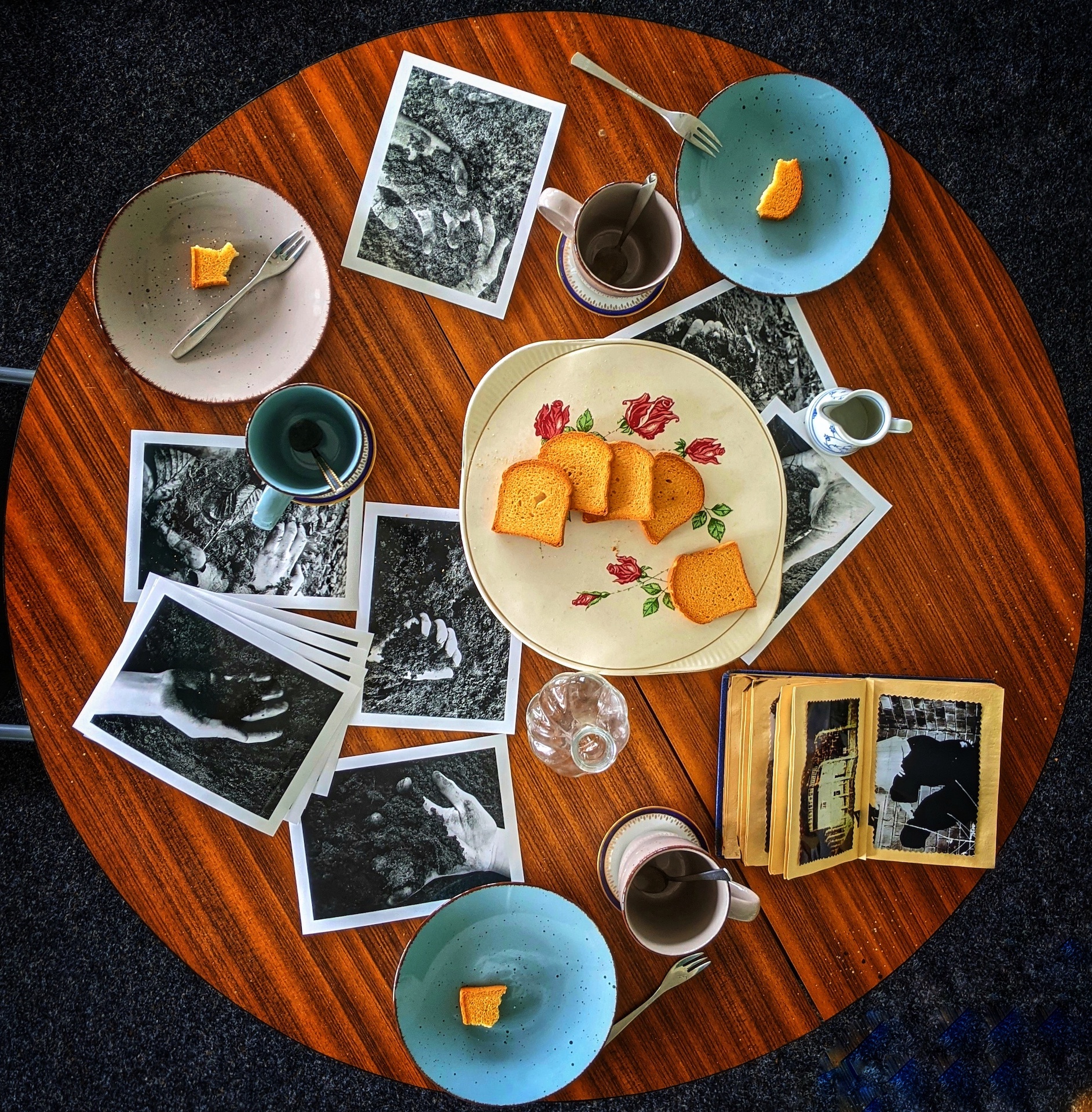 „Der gedeckte Tisch“, Installation der 9Rb (Holztisch, Kaffeeservice, Vase, Album und Fotos) 2021