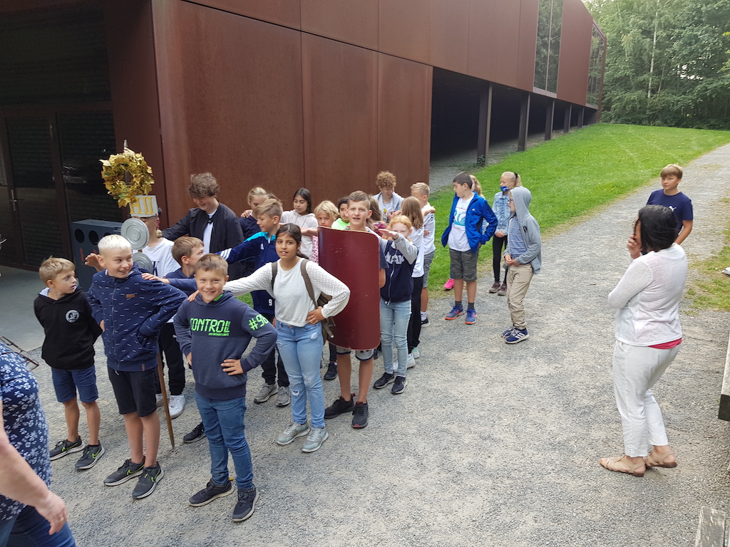 Doch dass auch dieses bis dahin größte Reich der Menschheitsgeschichte ausgerechnet auf niedersächsischem Boden die Grenzen seiner Macht erfahren musste, haben die Schülerinnen und Schüler der 6. Klassen bei der anschließenden Exkursion in den archäologischen Park in Kalkriese gelernt und erlebt, wo im Jahre 9 n. Chr. in der Varusschlacht drei römische Legionen, über 15.000 der bestausgebildeten Soldaten der Welt, von germanischen Aufständischen unter der Führung des Arminius vernichtet wurden. Die Kinder haben im weitläufigen Park bei bestem Sommerwetter nicht nur die spannenden Fundstücke und die Geschichte ihrer Ausgrabung kennengelernt, sondern durften auch selbst aktiv werden: In abwechselnden Rollen haben sich die Klassen gegenseitig als Germanen und Römer im Wald aufgelauert, römische Marschformationen und Kampftaktiken erprobt und sind in die Kleidung römischer Soldaten und germanischer Bäuerinnen geschlüpft. Bei einem Blick vom 40 Meter hohen Aussichtsturm aus konnten sie anschließend noch einmal das Schlachtfeld im größeren Zusammenhang der niedersächsischen Landschaft betrachten.