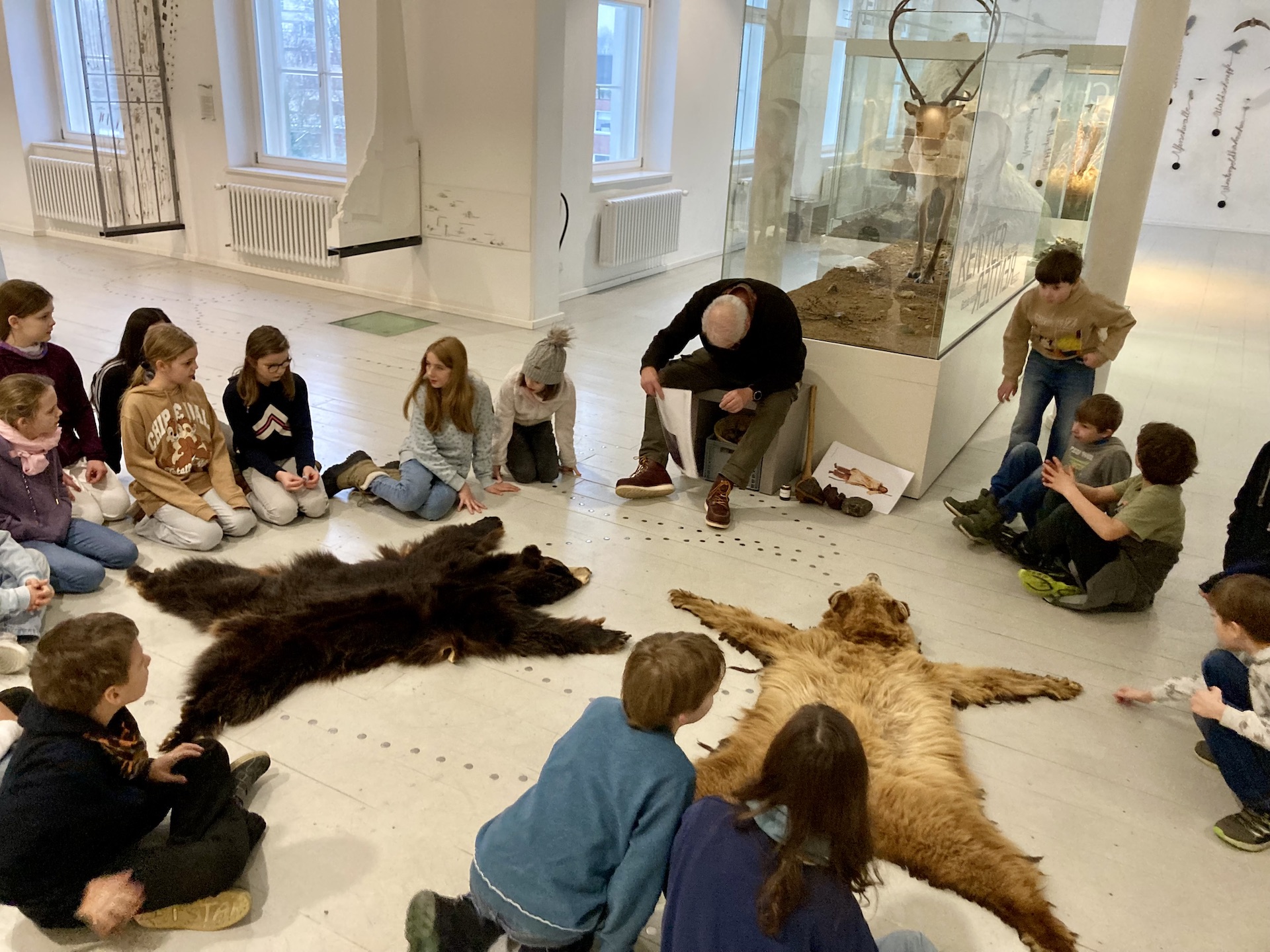 Im Museum begaben sich die Kinder auf eine faszinierende Reise durch verschiedene Epochen und Lebensräume. Besonders beeindruckend war die Ausstellung zur Ur- und Frühgeschichte. Hier konnten sie originale Fossilien und nachgebildete Skelette prähistorischer Tiere bestaunen. So manchem wurde bewusst, wie bequem unser heutiges Leben ist – ohne jagen oder sammeln zu müssen, um an Essen zu kommen.