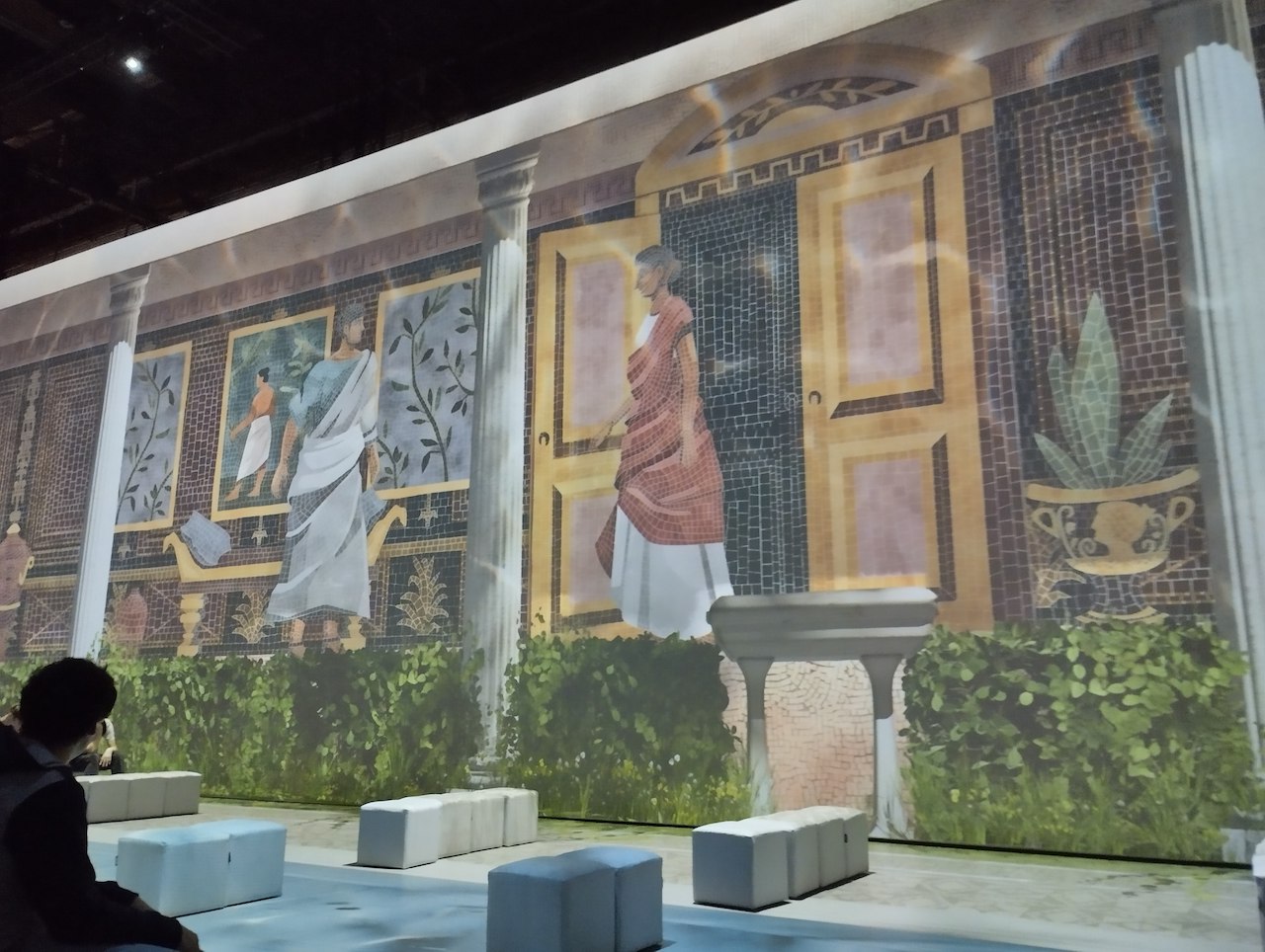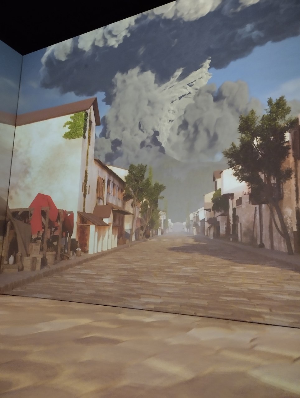 Nach der Ankunft in Oberhausen begaben wir uns zu Fuß in die Ausstellungshalle. Die ersten Räume der Ausstellung beinhalteten Funde aus Pompeji, wie z.B. Steintafeln, Theatermasken und sogar einige Gipsabdrücke von Menschen, die bei dem Vesuvausbruch ums Leben kamen. Nach diesen Räumen gelangten wir in einen Flur, in dem viele Informationstafeln, die einen auf die nächsten Räume vorbereiteten, hingen. Als wir den nächsten Raum betraten, fanden wir uns fast 2000 Jahre in der Zeit zurück und erlebten jenen Tag, an dem der Vesuv über Pompeji ausbrach und die Stadt unter Schutt und Asche begrub. Im 360-Grad-Raum waren wir von bewegten Bildern, Geräuschen und Musik umgeben. Wir begleiteten Plinius den Jüngeren durch diesen schrecklichen Tag und erlebten den Vesuvausbruch durch die 360 Grad-Technologie hautnah mit. In einem weiteren Raum wurde man mithilfe von VR-Brillen Zuschauer eines Gladiatorenkampfes, einer darauf folgenden Seeschlacht und dem Ausbruch des Vesuvs.