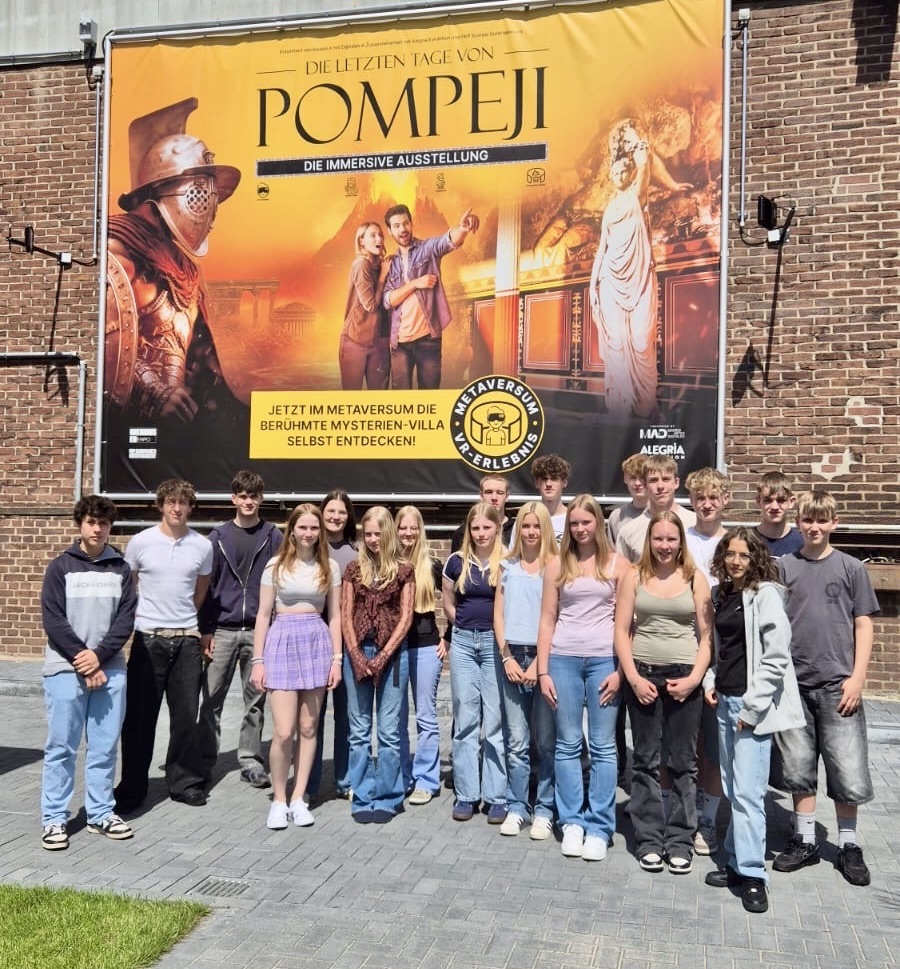 Am 17. Juni machten sich die Lateinkurse der 9. und 10. Klasse gemeinsam mit Frau Maurer und Herrn Brinkmann auf den Weg nach Oberhausen, um die immersive Ausstellung über Pompeji im OBEX (Oberhausen Expo) zu Besuchen. Das Ziel des Ausfluges war es, das im Unterricht behandelte Thema „Pompeji und der Vesuvausbruch“ durch die in die Ausstellung integrierten VR-Brillen „mitzuerleben“.
