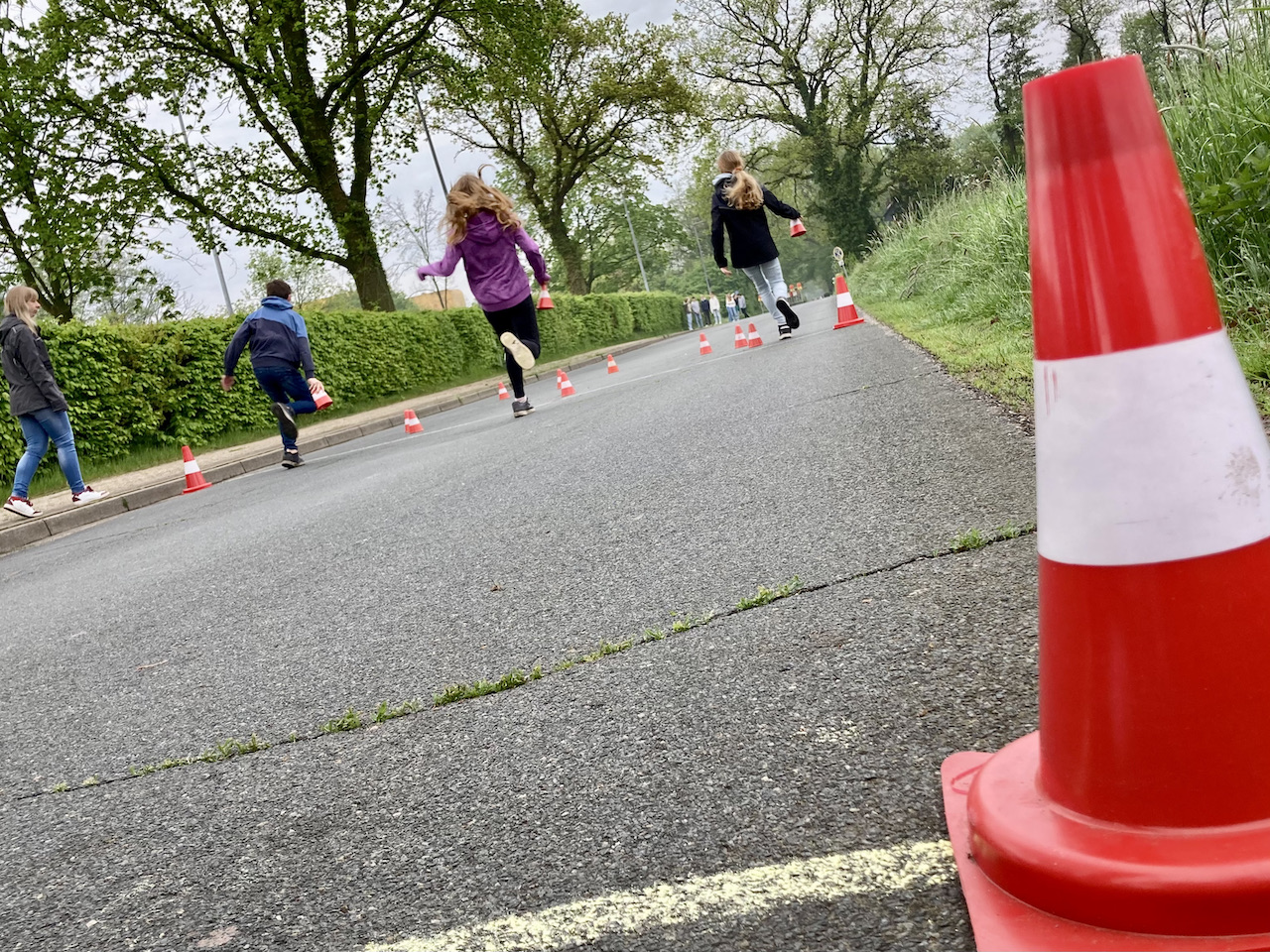 Um diesen weiteren Schritt in Richtung Sicherheit zu machen, haben die Schüler des 5. Jahrgangs einen Vormittag lang Bremswege erlebt und nachvollzogen. Der Hintergrund ist: Kinder sind noch nicht in der Lage, sicher die Geschwindigkeit und den Bremsweg eines Autos richtig einzuschätzen. Mit dem Programm „Achtung Auto“ von der ADAC Stiftung lernten Schüler auf spielerische Art und Weise, wie lang ein Bremsweg sein kann und wann die Reaktion eines Fahrers einsetzt.