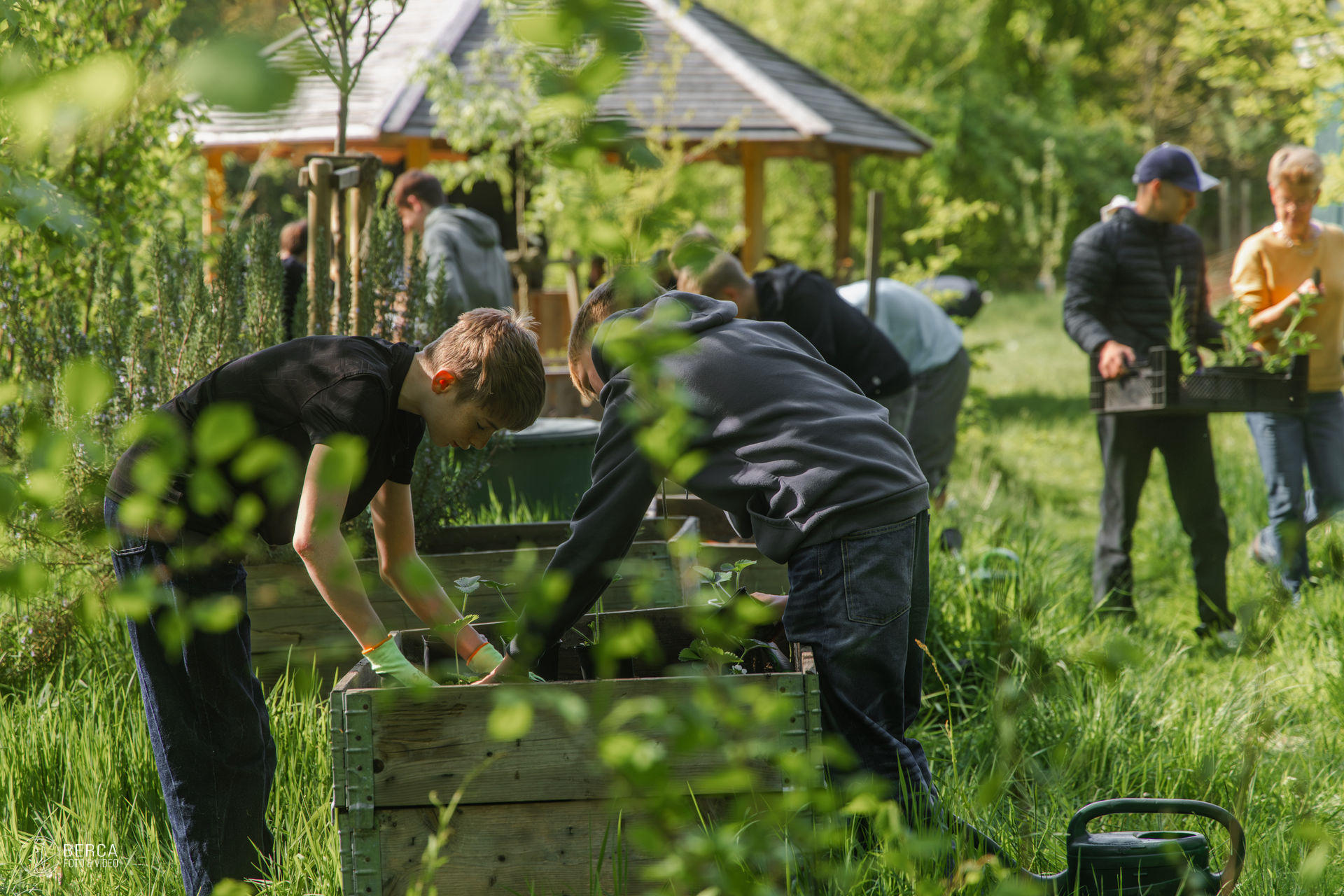 Bepflanzen der gereinigten Beete: Die Schülerinnen und Schüler bepflanzten die Hochbeete mit Küchenkräutern und Erdbeerpflanzen. Auf einem Teil der ehemaligen Kartoffelbeete wurden im Zuge der Fruchtfolge in diesem Jahr Wildblumen und Leguminosen ausgesät, um die Bodenqualität zu verbessern und die Insektenpopulation zu unterstützen.