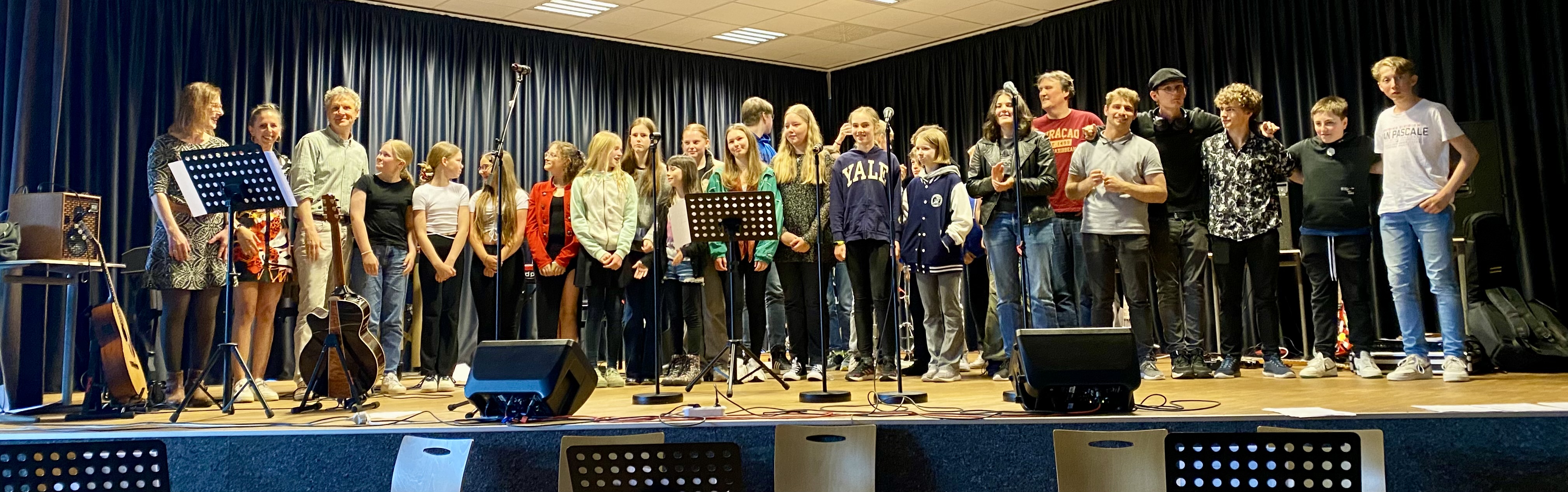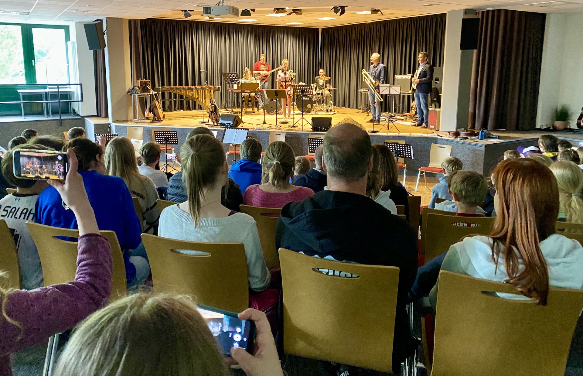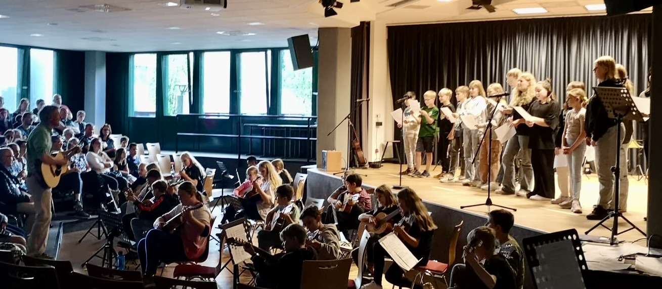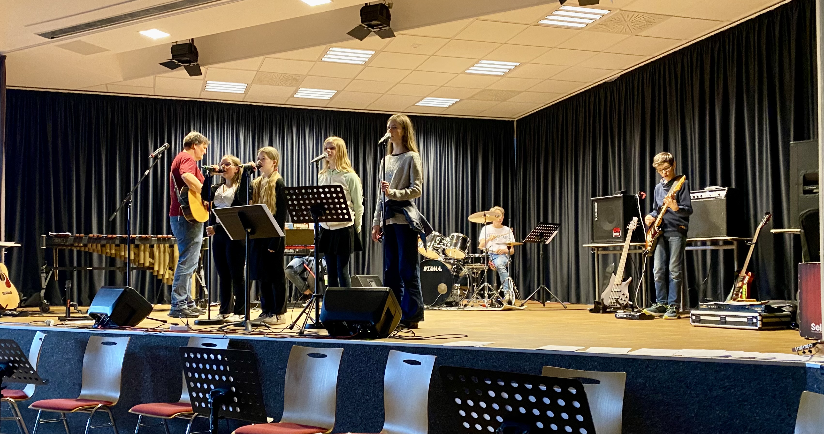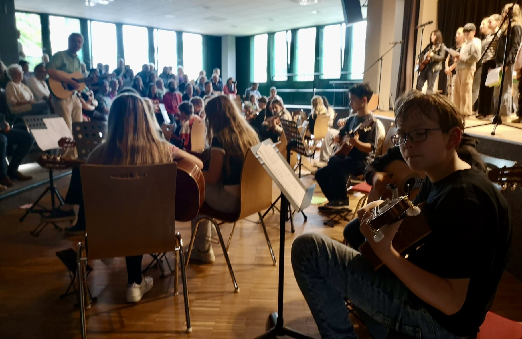 Auch der erste Musikabend am 30. Mai bot ein buntes und abwechslungsreiches Programm. Die Schülerinnen und Schüler der Gitarren- und Bläserklassen zeigten immer wieder, dass sie Spaß am Musizieren und Singen hatten. Und die zahlreichen Zuschauer ließen sich nicht lange bitten, wenn es galt, bei dem einen oder anderen bekannten Lied mit einzustimmen. Hervorzuheben ist auch das selbst komponierte Lied „Das Rezept“ der Klasse 6a, welches die Schülerinnen und Schüler in diesem Schuljahr anlässlich der Auszeichnung „Schule mit Courage/Schule gegen Rassismus“ unter der Leitung von Herrn Mattenheimer komponierten.