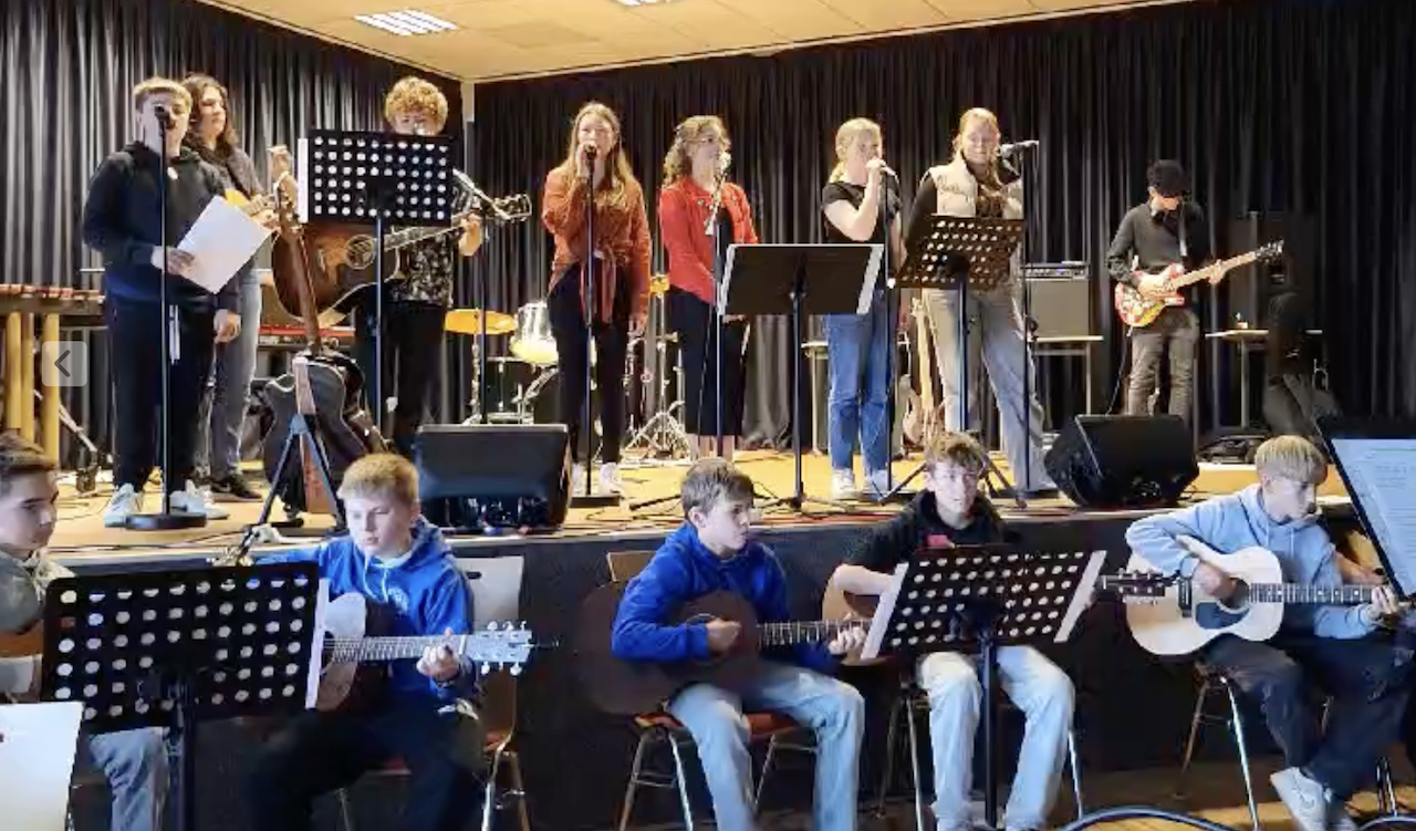 Danach startete die Gitarren-AG, welche bei ihrem ersten Stück „Viva la vida“ kräftig von den Schülerinnen und Schülern der Bläserklasse (Klasse 6) unterstützt wurden. Ob „Tage wie diese“ von den Toten Hosen, „Budapest“ von George Ezra, „My Hero“ von den Foo Fighters. „Pompeji“ von Bastille, alles wurde souverän gemeistert und das Publikum stieg gesanglich immer wieder mit ein und sorgte für ordentlich Atmosphäre. Vielen Dank noch einmal an Luca von Häfen, der nun mit seinem Schulabschluss zum letzten Mal die Gitarren-AG an diesem Abend mit seinem Gitarrenspiel unterstützte und sich jahrelang intensiv musikalisch im Schulleben der Schule engagierte.