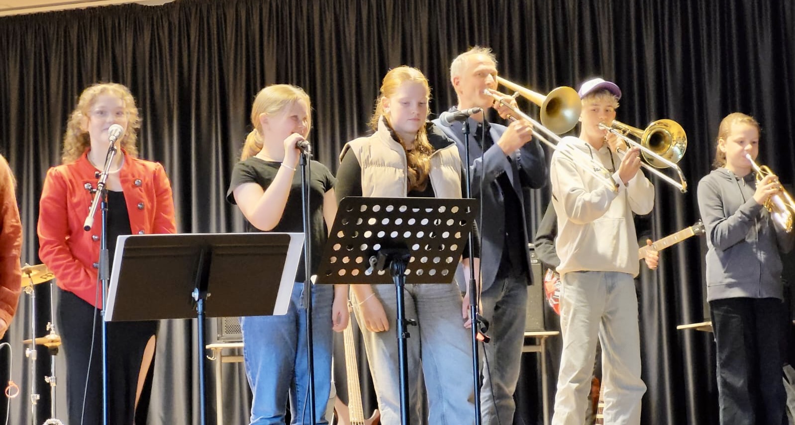 Die PUS-Lehrerband startete mit „Skyfall“ und die Schülerinnen und Schüler staunten nicht schlecht, ihre LehrerInnen in der für sie ungewohnten Rolle zu sehen. Frau Frau Al-Halabi-Seifert und Frau Hermann ließen mit ihrem Gesang echte 007-Stimmung aufkommen und passend zum Stück begleiteten Herr Kessler und Herr Grau sie dabei mit Posaune bzw. Trompete. Herr Morawietz am Schlagzeug und Herr Dreier am Bass rahmten das Lied dabei ein.