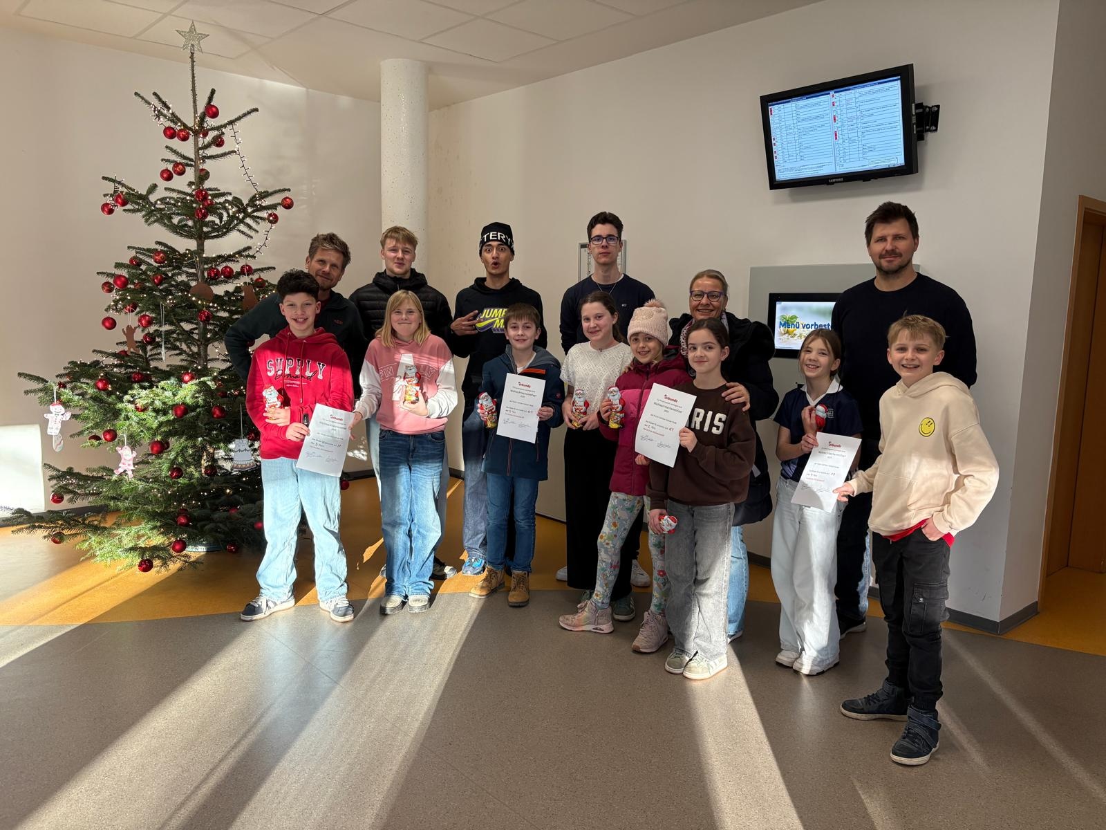 Die Stimmung in der Schwimmhalle war durchgehend ausgelassen. Alle Klassen feuerten sich gegenseitig an und hatten sichtlich Spaß an den sportlichen Herausforderungen. Am Ende wurden alle Teilnehmenden für ihren Einsatz belohnt: Jede Schülerin und jeder Schüler erhielt einen Schokoweihnachtsmann, zudem wurden Urkunden für die Klassen überreicht.