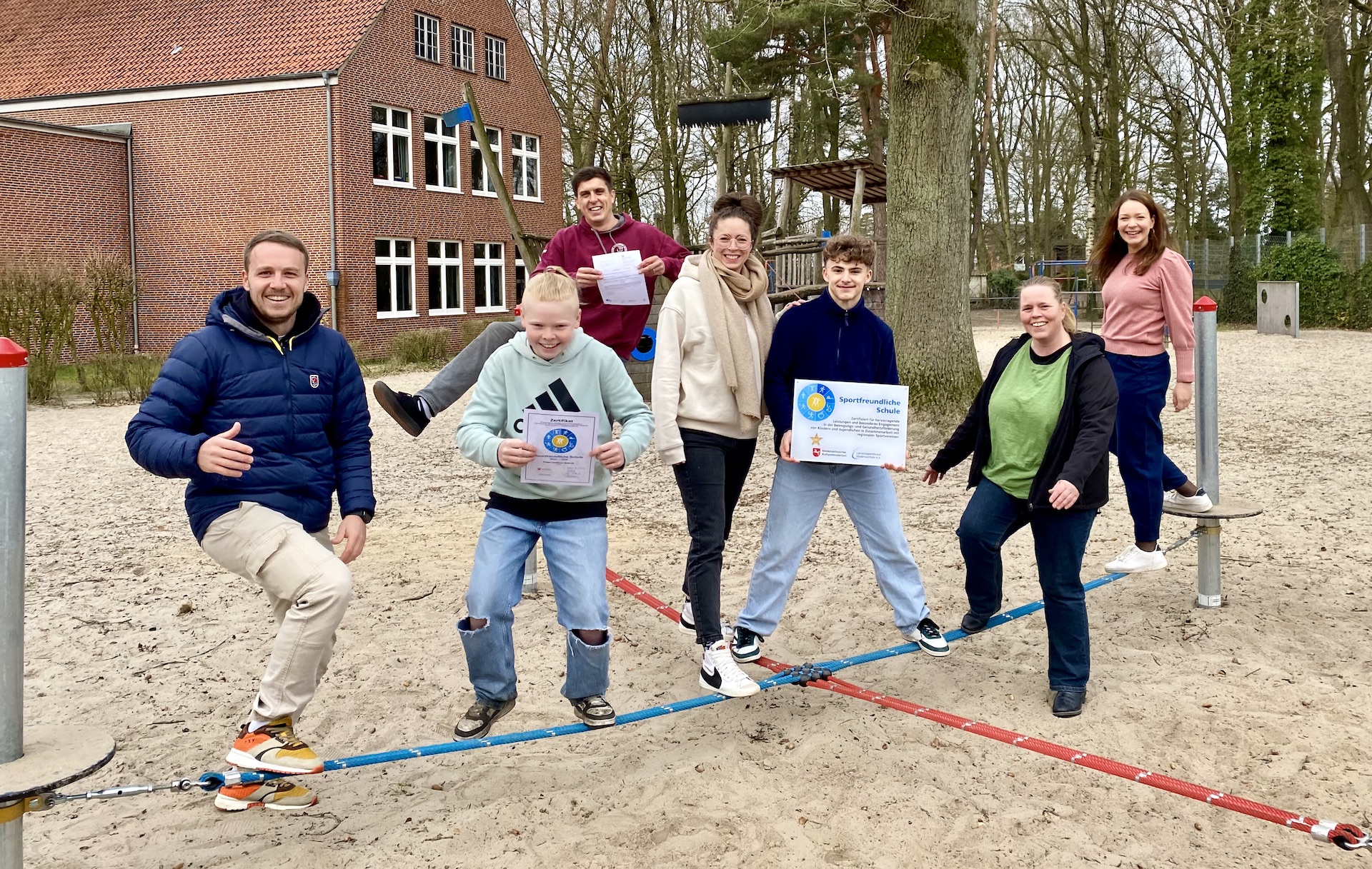 Die feierliche Übergabe der Urkunde fand am 1-2.03.2025 auf dem Pausenhof der Hohelucht statt, direkt an dem neuen Pausenspielgerät, einer sogenannten „Slackline“. Dieses innovative Spielgerät, das sowohl Gleichgewichtssinn als auch Koordination fördert, wurde durch die großzügige Unterstützung des schulischen Fördervereins sowie durch eine Spende der Landessparkasse zu Oldenburg angeschafft.