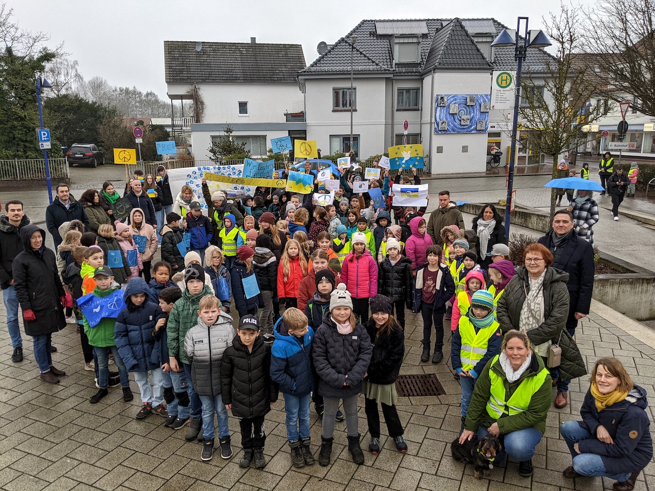 Am 23. Februar, einen Tag bevor sich der grausame Angriff Russlands auf die Ukraine zum ersten Mal jährte, bekundeten ca. 120 Lernende der sechs Huder Schulen ihre Solidarität mit dem ukrainischen Volk und setzten mit einem kleinen Sternmarsch durch den Ort ein Zeichen für den Frieden. Die Abordnungen der Schulen versammelten sich zum Abschluss der Veranstaltung zu einer Kundgebung auf dem Huder Bahnhofsvorplatz, wo sowohl der Schulleiter der Peter-Ustinov-Schule, Herr Grau, als auch der Bürgermeister, Herr Skatulla und die stellvertretende Landrätin, eindringliche Worte an die Schüler*innen richteten. Der Huder Appell mag zwar nur ein kleiner Baustein im „Haus des Friedens“ sein, doch zeigt er, dass das Mitgefühl für das europäische Brudervolk nicht erloschen ist! In den Klassen begegnen sich täglich unsere Lernenden mit den ukrainischen Gästen, was das Grauen dieses sinnlosen Krieges immer wieder in Erinnerung bringt. Die Bereitschaft, über das Thema zu sprechen und etwas zu unternehmen, ist deshalb nach wie vor sehr groß!