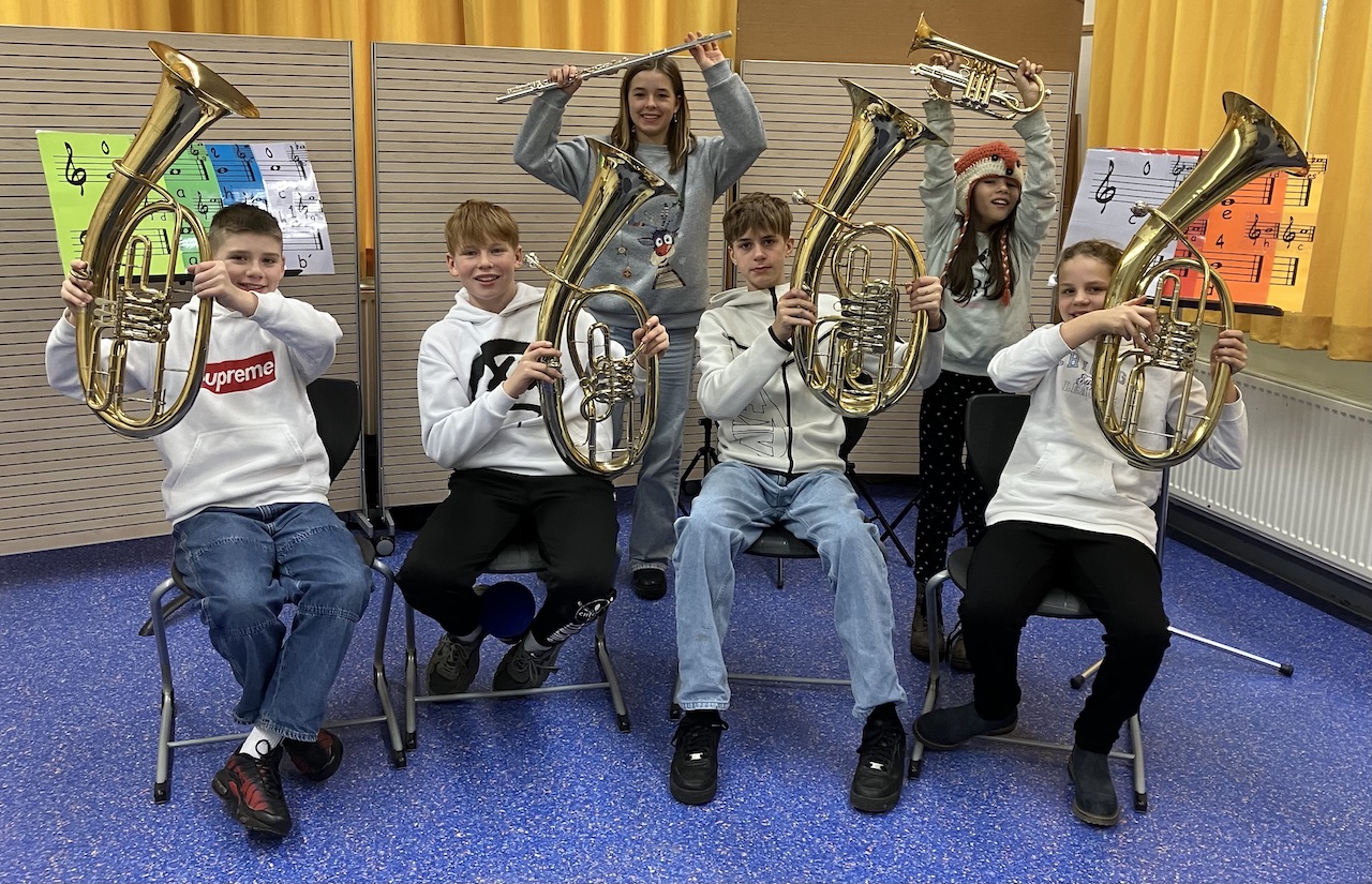 Die Instrumente in den Händen der Kinder aus der Bläserklasse 6d. Von links: Linus, Henry, Juna, Carlo, Maia, Mia.