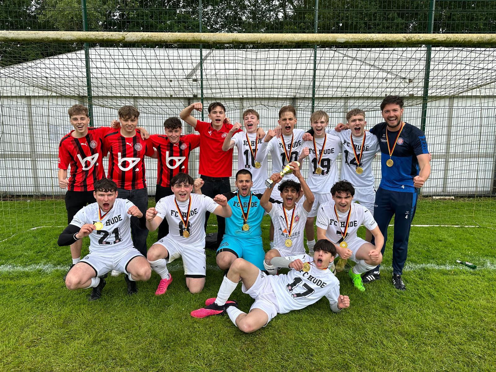 Unser pädagogische Mitarbeiter Torben Hellemann engagiert sich in seiner Freizeit als A-Jugendtrainer beim heimischen FC Hude von 1949 e.v. Er schaffte nun am vergangenen Samstag durch einen 7:3 Sieg gegen die JSG Rechterfeld/Goldenstedt - gemeinsam mit vier Fußballern aus unserem 10. Jahrgang - den Aufstieg in die nächsthöhere Spielklasse.