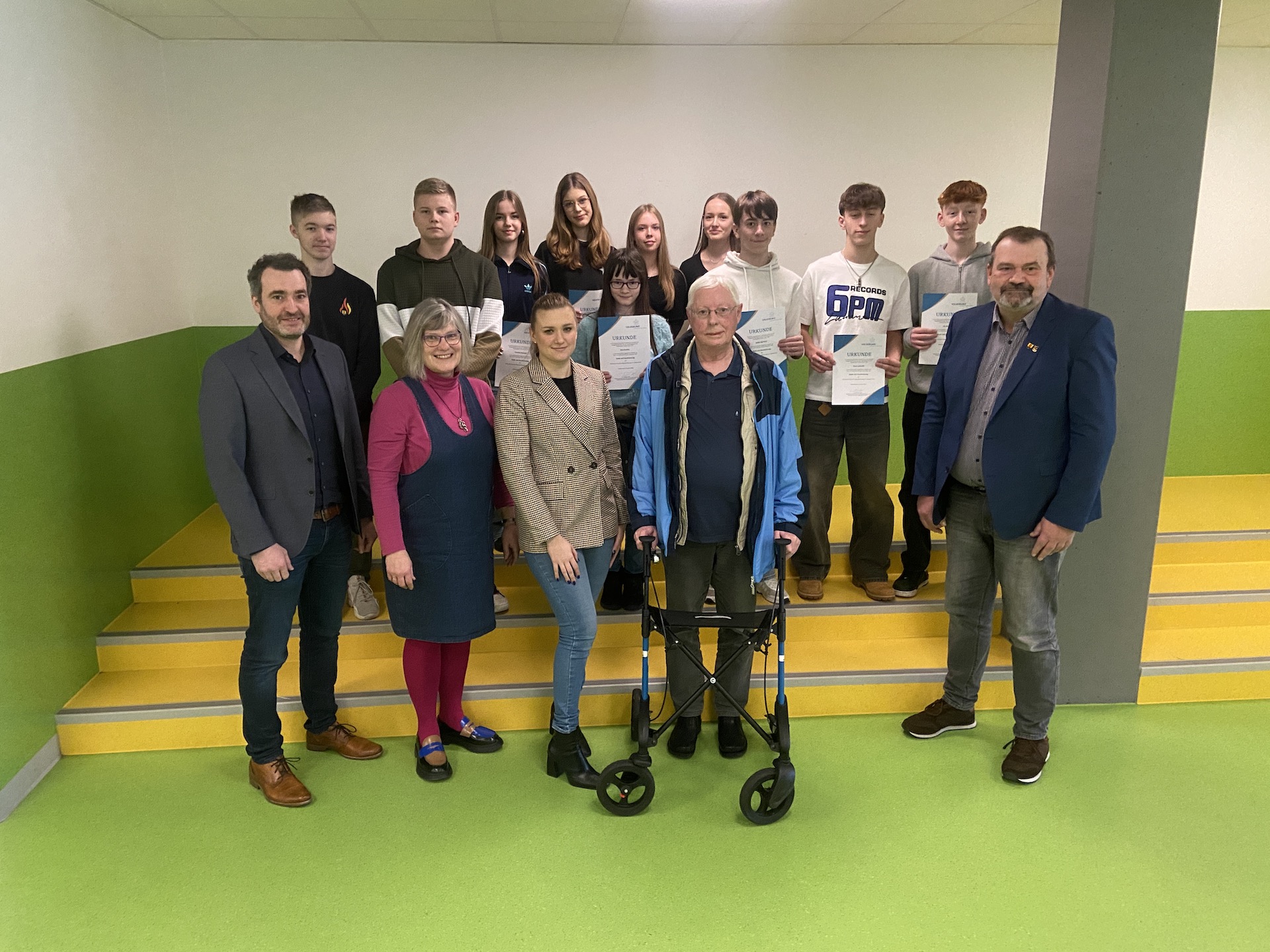 In diesem Kontext und im Angesicht der aktuellen politischen und gesellschaftlichen Lage sei es eben keine Kleinigkeit, in seiner Freizeit von Haus zu Haus zu gehen und Spenden zu sammeln, betonte Schulleiter Matthias Grau, sondern eine besondere Haltung, die die Jugendlichen mit ihrem freiwilligen außerschulischen Einsatz zeigten. In diesem Sinne äußerte sich auch der stellvertretende Bürgermeister der Gemeinde. Er fügte hinzu, dass die heute verliehene Urkunde, die zu seiner Zeit als „uncool“ gegolten habe, in unserer Zeit eine hohe Bedeutung erhielte. Herr Grau ergänzte zum Schluss, dass Betriebe, die diese Urkunden, aber auch Nachweise anderer ehrenamtlicher Tätigkeiten in Bewerbungsunterlagen fänden, diese in gewissen Fällen höher bewerteten als sehr gute Zensuren, denn sie zeigten, dass die Bewerberinnen und Bewerber etwas mitbrächten, das eben nicht gelehrt und gelernt werden könne, nämlich Verantwortungsbewusstsein und Einsatz.