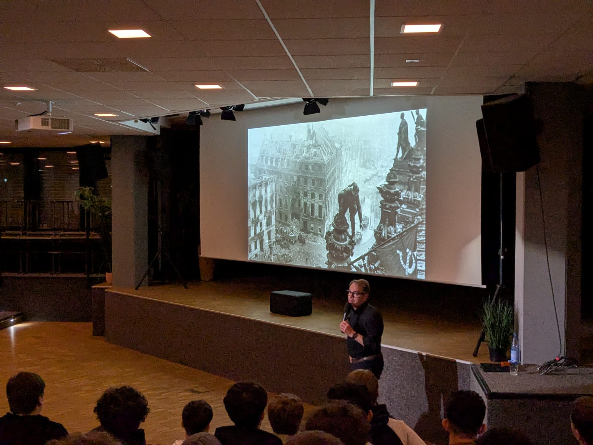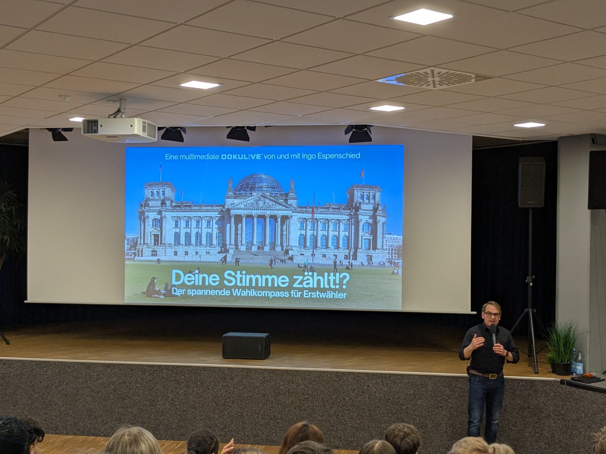 Am 27.01.2025 fand deshalb für die Jahrgänge 9 und 10 die Veranstaltung „Deine Stimme zählt“ mit dem bekannten Politikwissenschaftler und Journalisten Herrn Ingo Espenschied statt. Die doppelte Bedeutung des Tages war also ein Blick zurück, der uns daran erinnert, welche Konsequenzen der Verlust demokratischer Werte und Rechtsstaatlichkeit haben kann. Und ein Blick nach vorn.