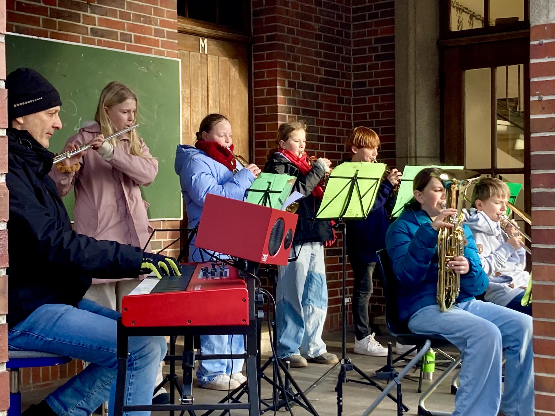 Noch zwei Tage bis Weihnachten und dann noch Unterricht. Klingt nicht aufregend? In der zweiten großen Pause am Donnerstag war bei den Kindern der Bläserklasse die Aufregung aber groß: Die Bläserklasse der Peter-Ustinov-Schule brachte mit ihrem Weihnachtskonzert festliche Stimmung auf den Pausenhof. Mit der Begleitung auf dem Piano von Reinald Keßler präsentierten die jungen Musikerinnen und Musiker eine Auswahl beliebter Weihnachtslieder. Die Klänge erfüllten den Pausenhof und zogen Schülerinnen, Schüler sowie Lehrkräfte gleichermaßen an. Begeisterte Gesichter und spontaner Applaus zeigten, wie sehr die Darbietung geschätzt wurde.