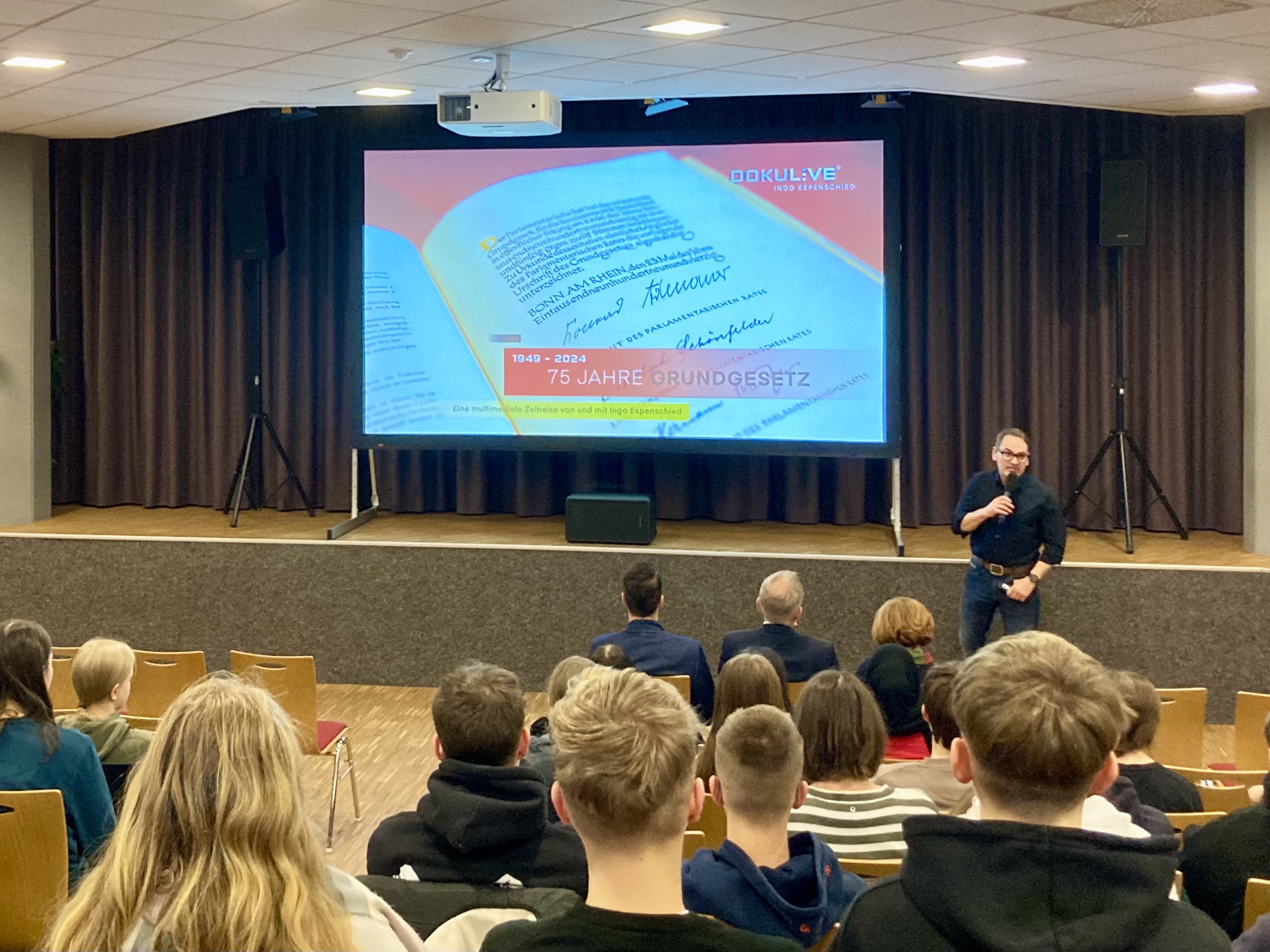 „Wir müssen alle etwas dafür tun.“ Diese Aufforderung und Feststellung durchzog auch den multimedialen Vortrag vom international bekannten Politologen Ingo Espenschied, der anlässlich des 75. Geburtstags des Grundgesetzes in der Peter-Ustinov-Schule zu Gast war. Die GSW-Fachbereichsleiterin Julia Witte hatte zu diesem Vortrag an der Schule eingeladen.