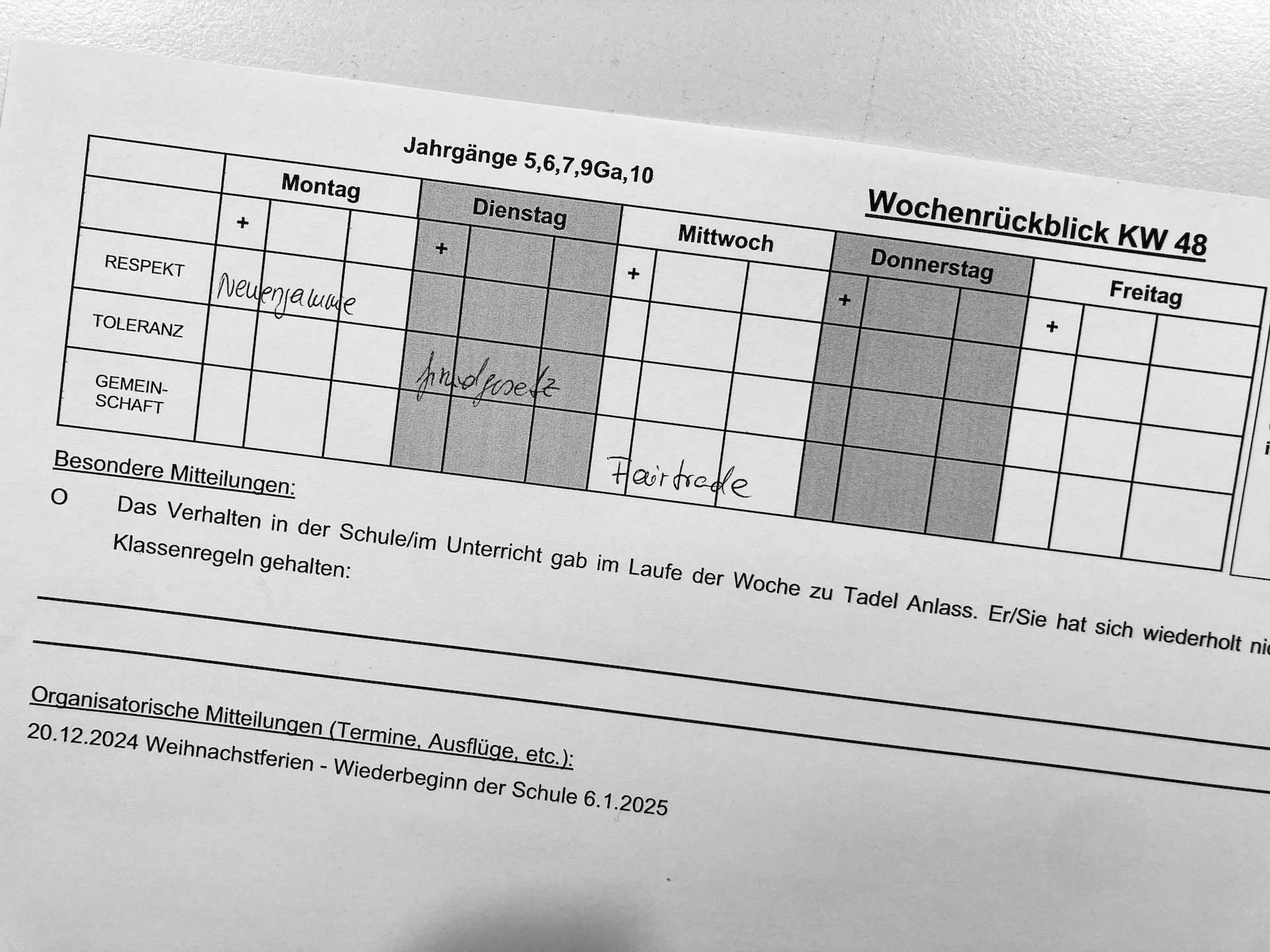 Beim Wort „Wochenrückblick“ erscheinen den SchülerInnen der Peter-Ustinov-Schule wohl vor dem inneren Auge die ausgedruckten A4-Zettel, die die Klassenlehrer in den Jahrgängen 5 und 6 immer freitags verteil(t)en.